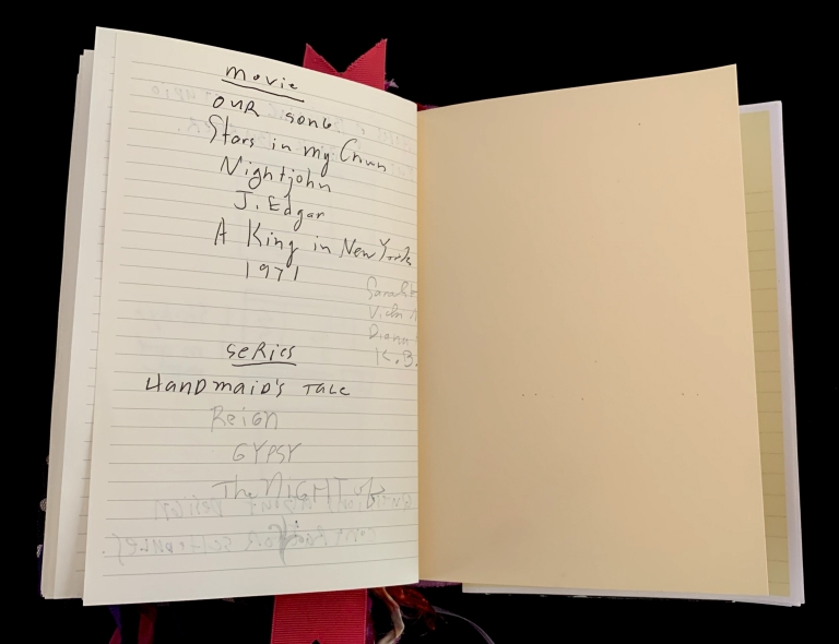 - Purple; Prince; June 7; Blank journal; Barnes and Noble; 2016–2017; Trump election; 29 Pieces; Funding crisis; Board realities; Come to Jesus moment; Remote work; Gut punches; Dana moves; Emotional loss; Political uncertainty; Life necessities; Calling the angels; Unshakeable faith; State of Contentment; Sacred feminine; Tramadol; Pleasing Daddy; Embodying HER; Yayoi Kusama; Frida Kahlo; Missing Barbara Boster; Mantrams for Trump; Anger chart; Charlottesville; Compassionate Path; Critical Path; Chronic hip pain; Angst and joy; Friendship and forgiveness; NYC trip; Times Square BID; Women artists; Left vs. right hand writing; No backyard studio