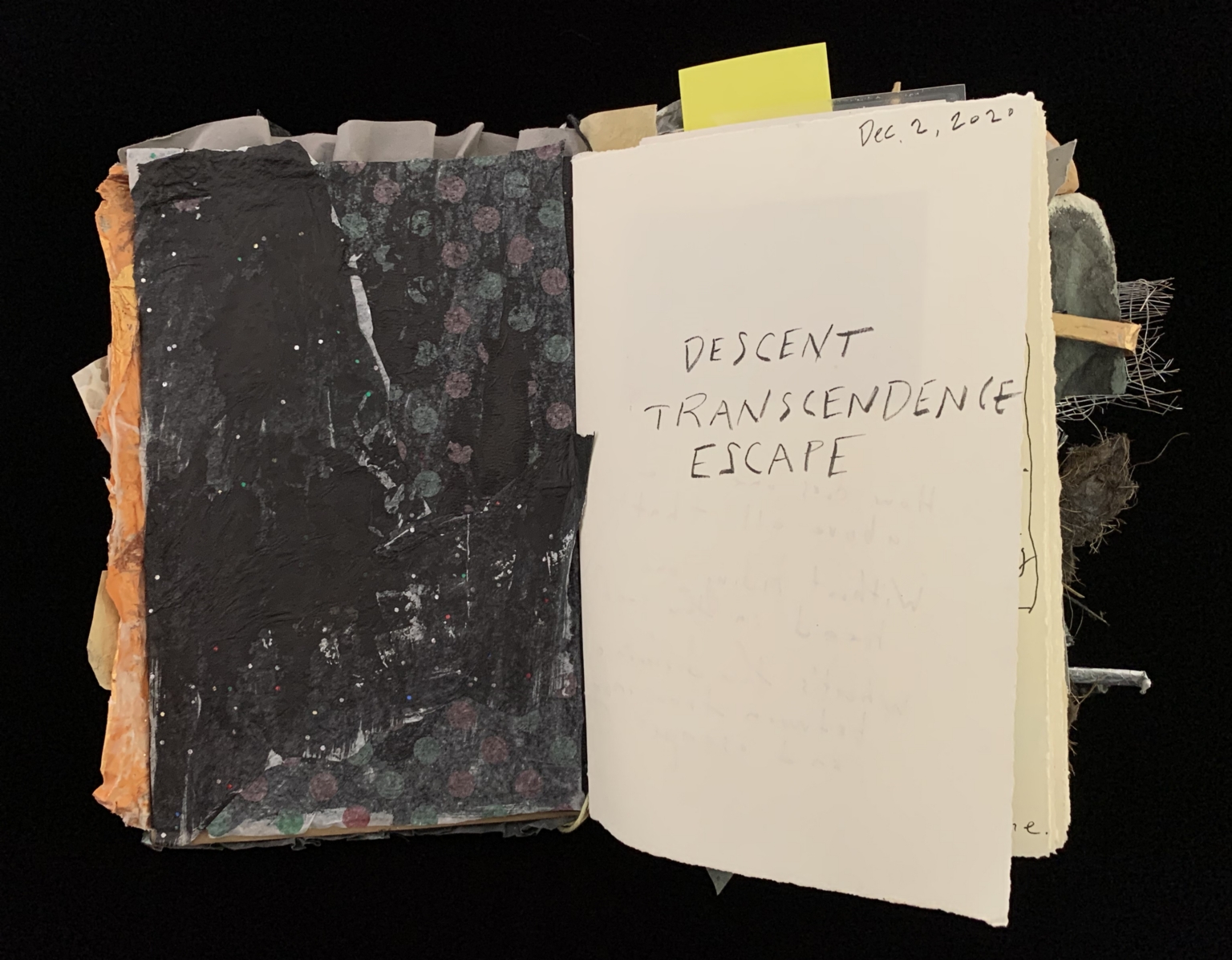 - The page features a textured, dark background with a variety of patterns and colors, possibly resembling fabric or paper with ink or paint. On the right side, there is a white piece of paper with handwritten text. The text is in a casual, handwritten style and reads "DESCENT TRANSCENDENCE ESCAPE." There is also a yellow sticky note at the top of the white paper with the date "Dec. 2, 2021" written on it.