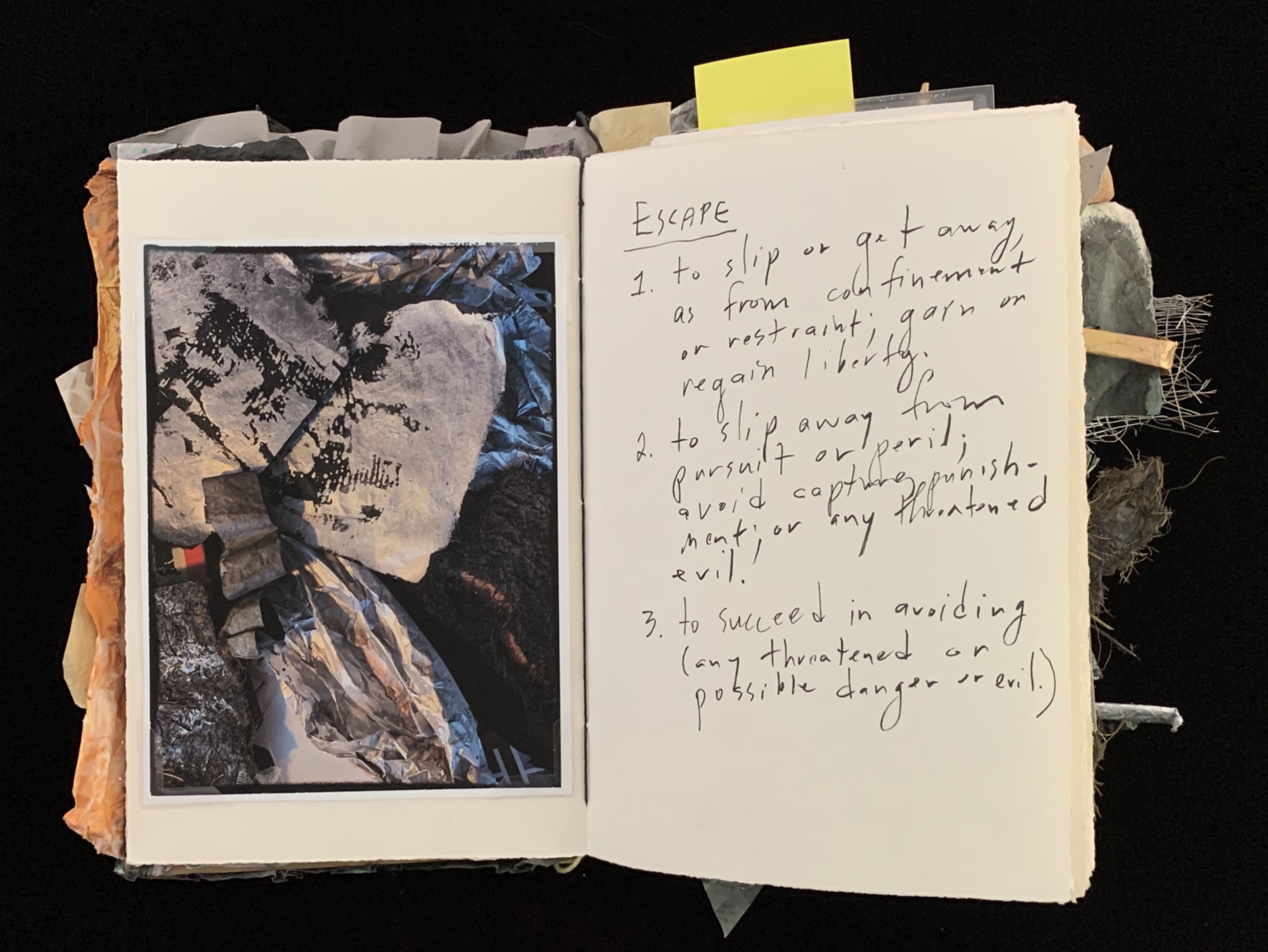 - The page contains a photograph on the left side, which appears to be a black-and-white image of a rocky landscape with a tree. The right side of the page has handwritten text defining the word "escape" with three numbered definitions. The page is surrounded by various pieces of paper and fabric, giving it a collage-like appearance.