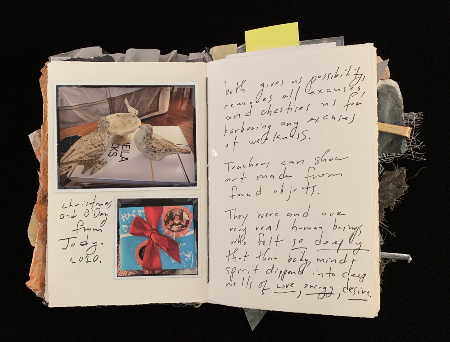 - The page is part of a scrapbook with a torn, textured edge. It contains a photograph of two ceramic birds, one labeled "Ella," placed on a table. Below the photograph is a smaller image of a gift wrapped in blue paper with a red ribbon. The right side of the page has handwritten notes discussing the potential of art, the removal of excuses, and the emotional depth of human beings. The notes also mention teachers and the use of found objects in art.