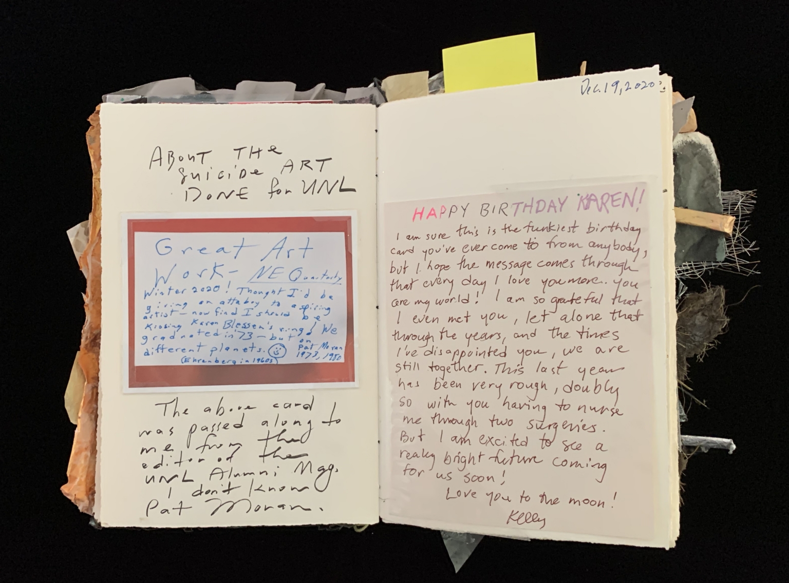 - The image shows an open book with handwritten notes and a small red-bordered card. The left page contains a note about suicide art and a reference to a work by Pat Moran. The right page is a birthday card addressed to Karen, expressing love and gratitude for her support through difficult times. The pages are slightly torn and have a textured appearance, suggesting they are part of a scrapbook or personal collection.
