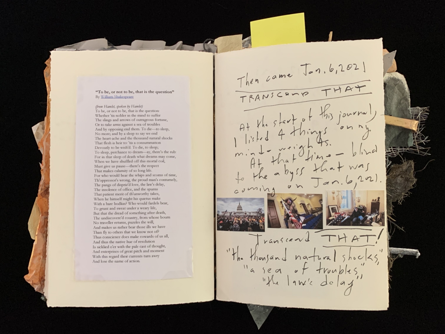 - The image shows an open journal with two pages. The left page contains a printed text of William Shakespeare's famous quote, "To be, or not to be, that is the question," from Hamlet. The right page has handwritten notes. At the top, it reads "Then came Jan. 6, 2021." Below this, there is a note about listing four things on the mind-weight. The bottom of the page includes two photographs: one of a crowd gathered in front of a building, and another of a room with people. The handwritten text continues with "Transcend THAT!" followed by a quote: "the thousand natural shocks, 'a sea of troubles,' 'the law's delay.'"