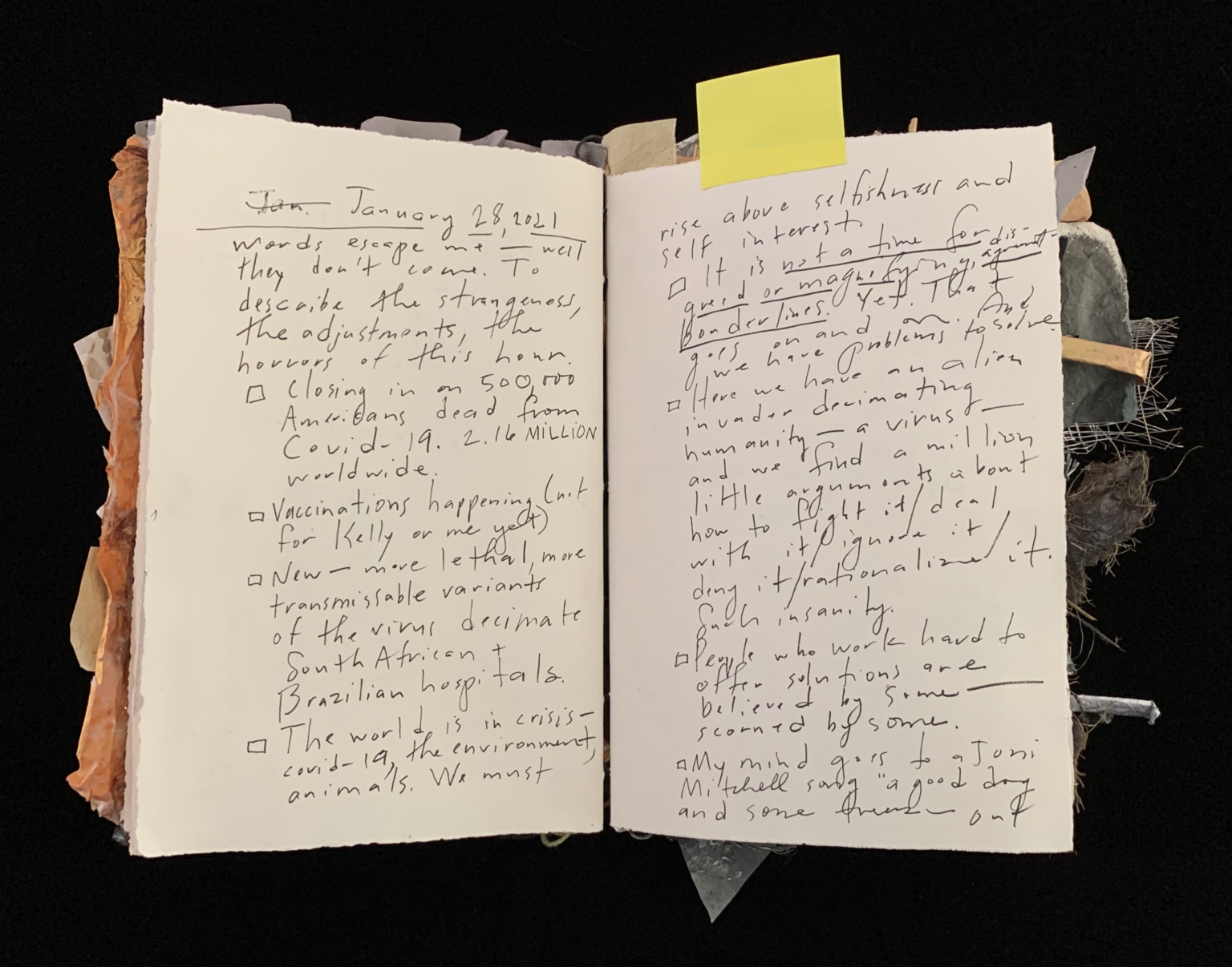 - The image shows an open journal with handwritten entries. The left page is dated "January 28, 2021," and the right page contains a list of thoughts and reflections. The journal appears to be bound with a rough, textured material, possibly fabric or paper, and has a yellow sticky note attached to the right page. The handwriting is neat and legible, with some bullet points and underlined text for emphasis.