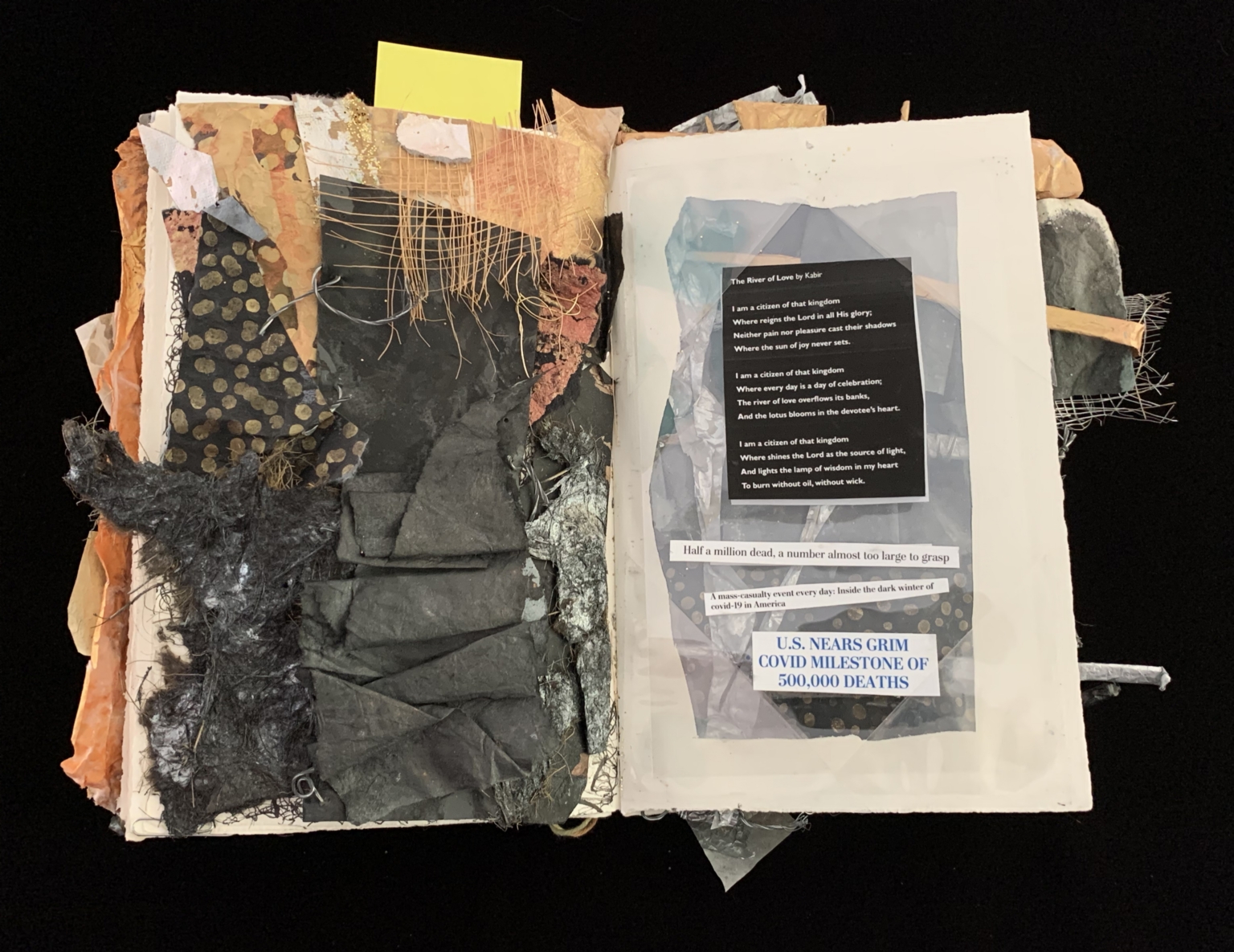 - The image showcases a page from a mixed-media art book. The left side is dominated by a collage of various fabrics and papers, including black, orange, and patterned materials, creating a textured and layered effect. The right side contains a white page with a poem titled "The River of Love to Kali" and a news headline that reads, "U.S. NEARS GRIM COVID MILESTONE OF 500,000 DEATHS." The poem is framed within a black border, and the headline is placed below it, both set against a background of fabric and paper scraps.