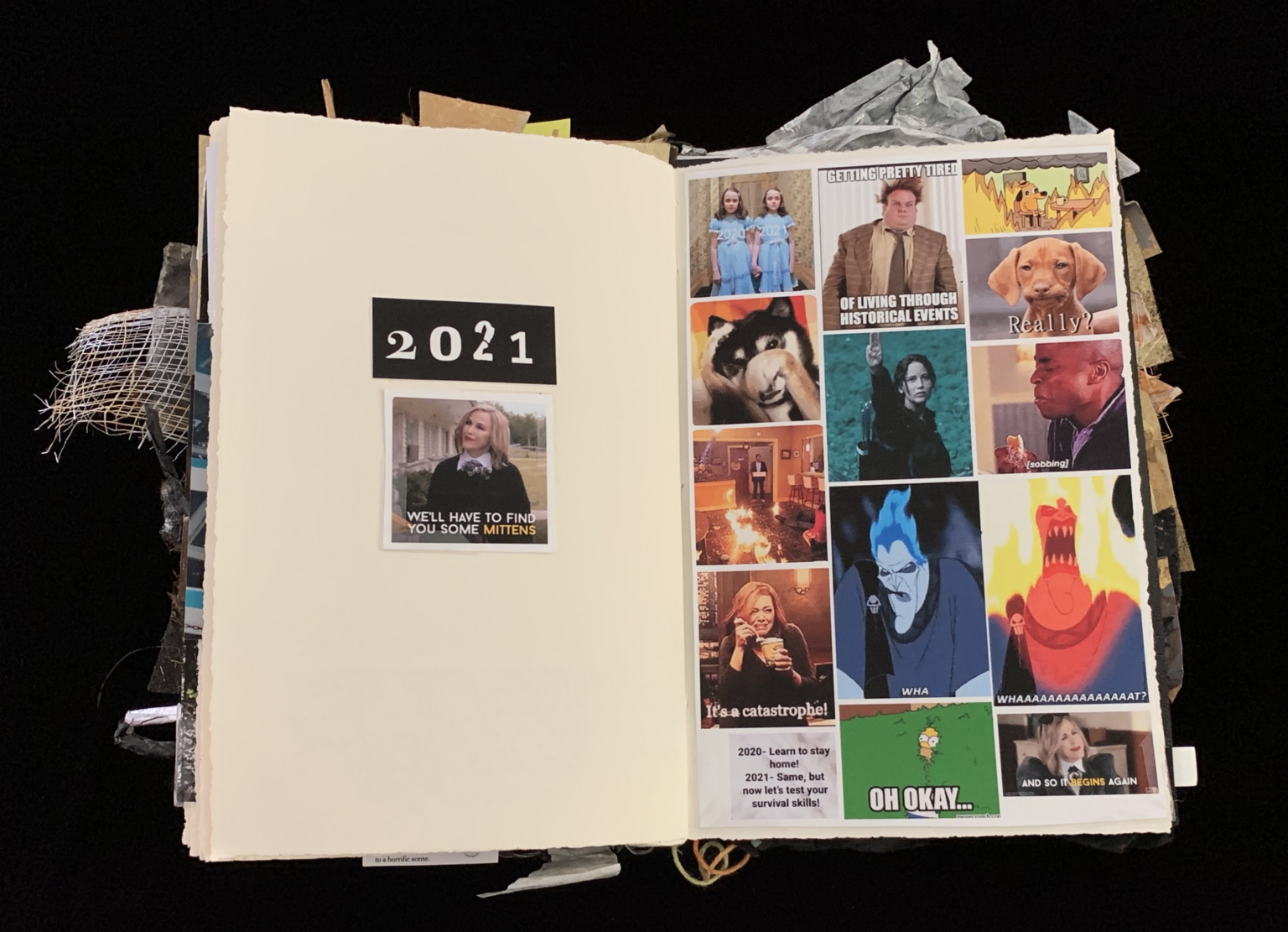 - Alchemy; Handmade journal; Terri Lenoir; Paper Arts; Covid-19 deaths; Trump lies; Illness of loved ones; Aging pets; Transcendence; Depression; Escape; Great Peacemakers Lesson; 69th birthday; Kelly’s card; 29 Pieces messaging; Love Knows No Distance; Quiet holiday; Kabir poems; Shakespeare bio; Jan. 6 insurrection; MLK essay; DMN 2003; SNL cold open; Lead to gold collage; American LOVE Project; Poppy Sundeen; THRIVE messaging; Valentine’s messaging; Super Power of love; Arctic freeze; Texas power outage; Randy Twaddle; Freeze photos; Lea Marshall; Tree of life; Calamities and trials; 10 years of journals; 2021 memes; $125K gift; Hudson Foundation; Weaving Your Name