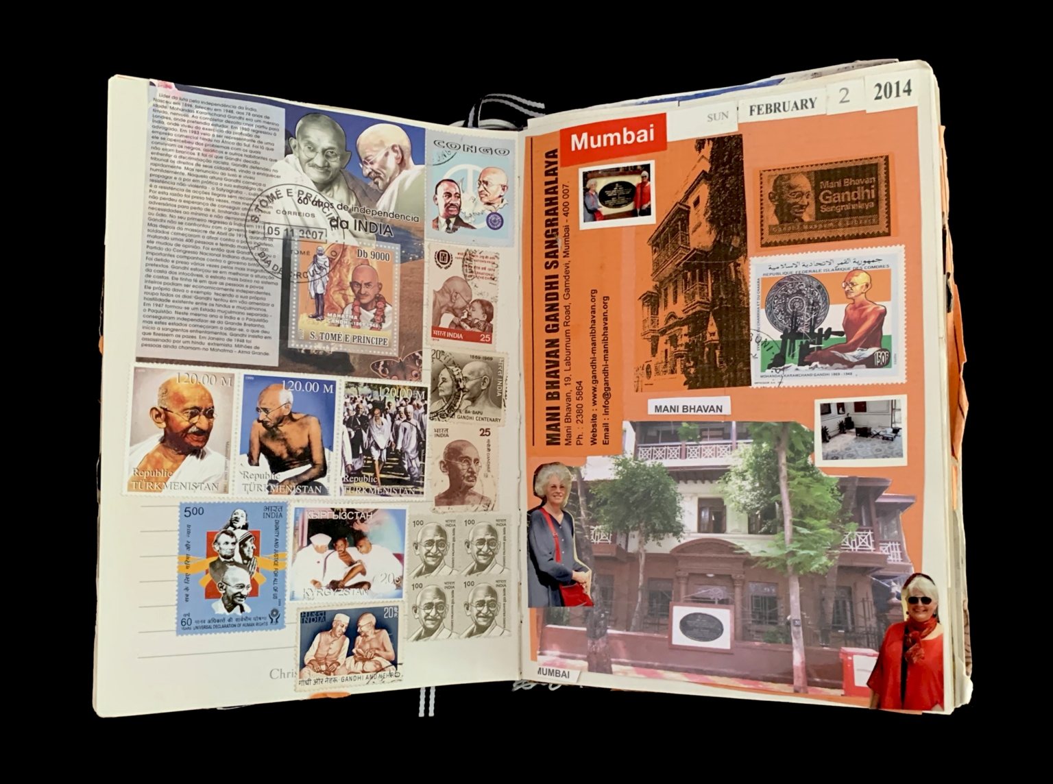 The right page features a large orange section with the title “Mumbait the top and a central black-and-white illustration of a building, labeled as “Mani Bhavan.longside are printed stamps and smaller images of the building from different angles. Text on the page includes the address and contact details of Mani Bhavan Gandhi Sangrahalaya. Below is a collage of two photographs of a woman standing in front of the building, with trees visible around it. The two pages are held open, displaying both pages' detailed contents in a vivid and organized layout. - Identifier