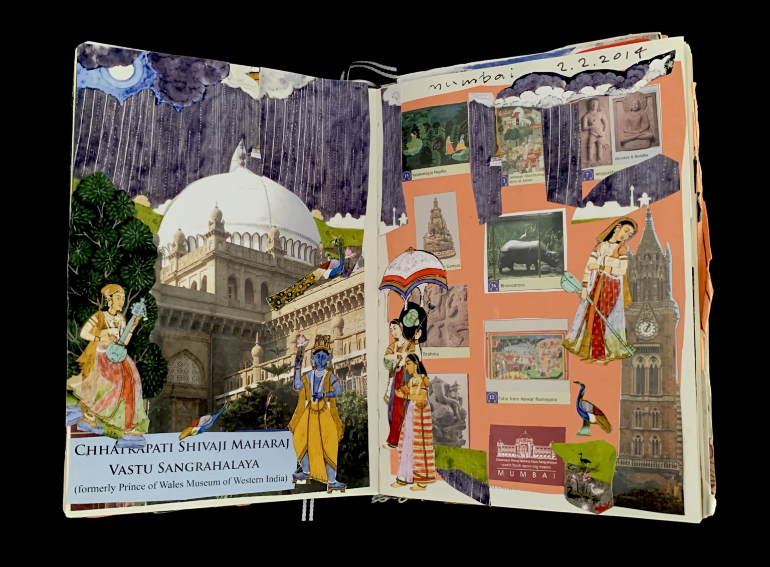 - The image shows an open notebook, with both pages decorated in a collage style. The left page features a large image of a domed building, surrounded by various cutouts of traditional Indian figures, trees, and a musical instrument. Above, dark clouds with rain and thunder motifs frame the scene. The right page includes assorted cutouts of historical artifacts, with orange paper serving as a backdrop. There are images of sculptures, a rhinoceros, and people with traditional attire. At the top, handwritten text is visible. The bottom section of the collage on both pages is bordered by a strip featuring the logo of a museum and a text plaque.