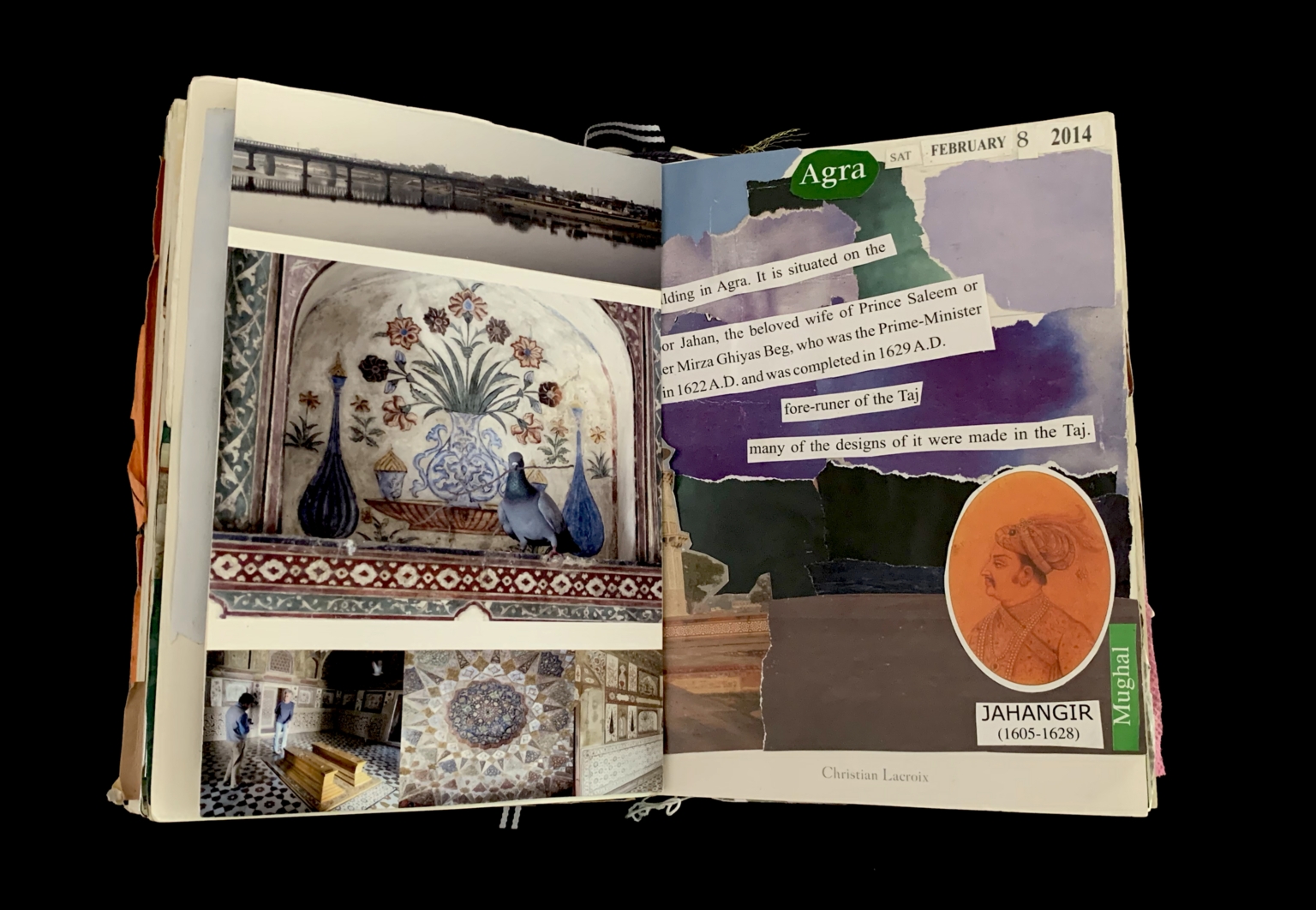 - The image depicts an open scrapbook displaying various images and texts. On the left page, there is a large photograph showing intricate floral and geometric tile work, with a pigeon perched in front. Below it are two smaller photographs depicting interior views of a historical building with ornate wall decorations. On the right page, there are colorful layers of torn paper, with sections of text pasted on top. The top right features the word "Agra" in white on a green background, along with a date marker "FEBRUARY 8 2014". A prominent orange oval on the lower right contains an illustration of a historical figure and a label "JAHANGIR (1605-1628)" with a green label "Mughal" beside it. The bottom of the page contains the text "Christian Lacroix."