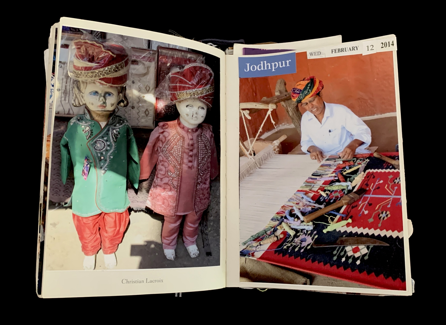 The image features two pages of a photograph album. On the left page, there are two mannequins adorned in traditional Indian attire. The mannequin on the left wears a green jacket with intricate embroidery and red pants, while the one on the right is dressed in a pink outfit with similar adornments. Both are topped with ornate hats wrapped in plastic. The background is filled with various textiles.