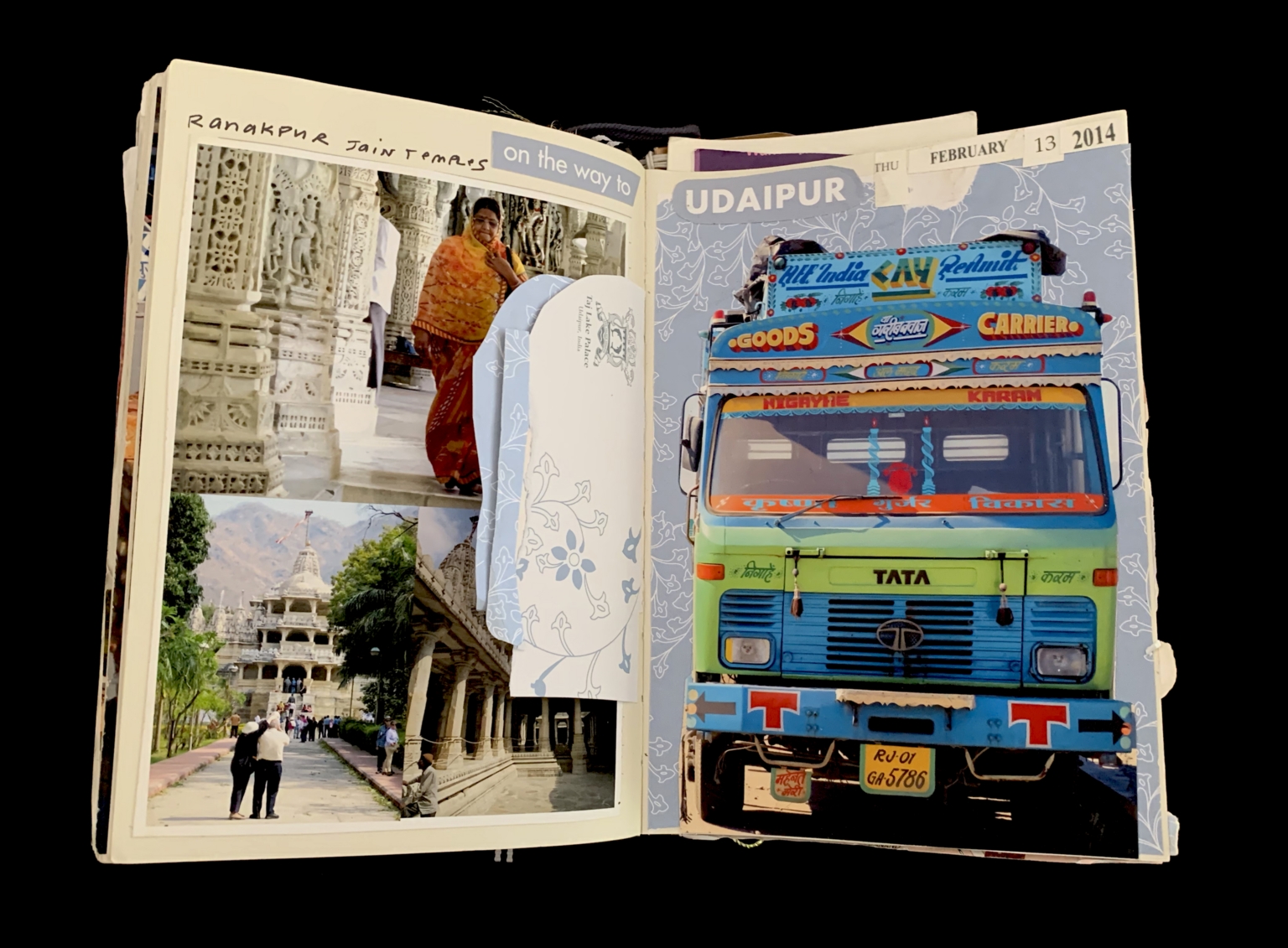 - The image shows an open scrapbook displaying two pages. The left page features photographs and a paper insert. At the top left, there is a picture of a woman in colorful traditional attire standing next to intricately carved stone pillars, likely from a temple. Below are two more images: one depicting a path leading to a temple structure surrounded by lush greenery, and the other showcasing numerous columns in a traditional architectural setting. There is a decorative paper with a blue floral design partly covering these images. The right page has a vibrant picture of a colorful Indian truck with various designs and text in multiple languages. The background includes a subtle floral pattern. The date “FEBRUARY 13 2014 is visible on a tab at the top, and the page is titled “UDAIPUR.