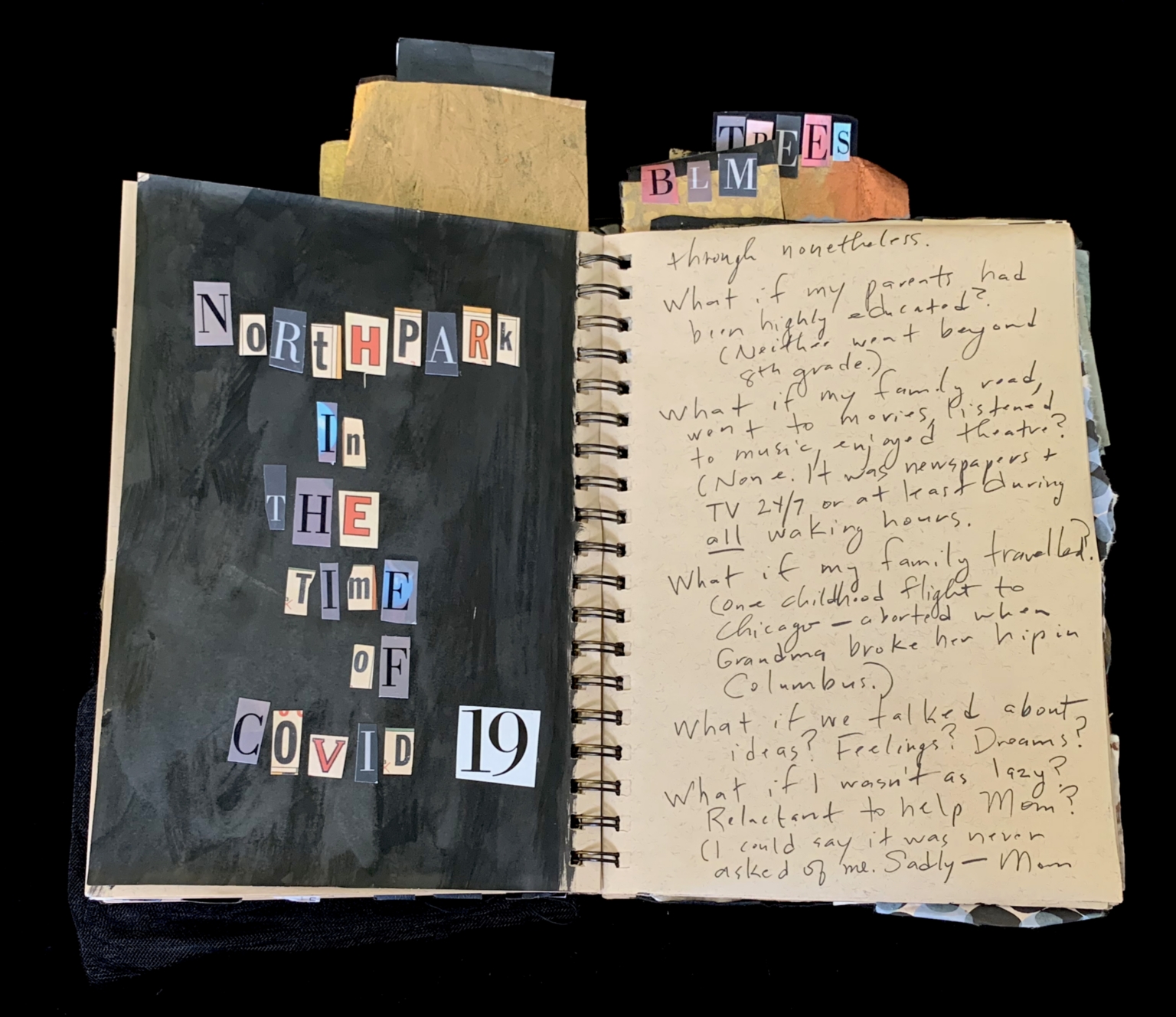 - The page is part of a spiral-bound notebook. On the left side, the title "Northpark in the Time of COVID-19" is constructed using cut-out letters in various colors and fonts. The right side contains handwritten text discussing hypothetical scenarios and reflections on family history and personal experiences. The background of the left side is dark, possibly black or a dark gray, while the right side has a lighter, beige background. There are small, colorful cut-out letters scattered at the top of the right page, forming the word "TREES" and other fragmented words.