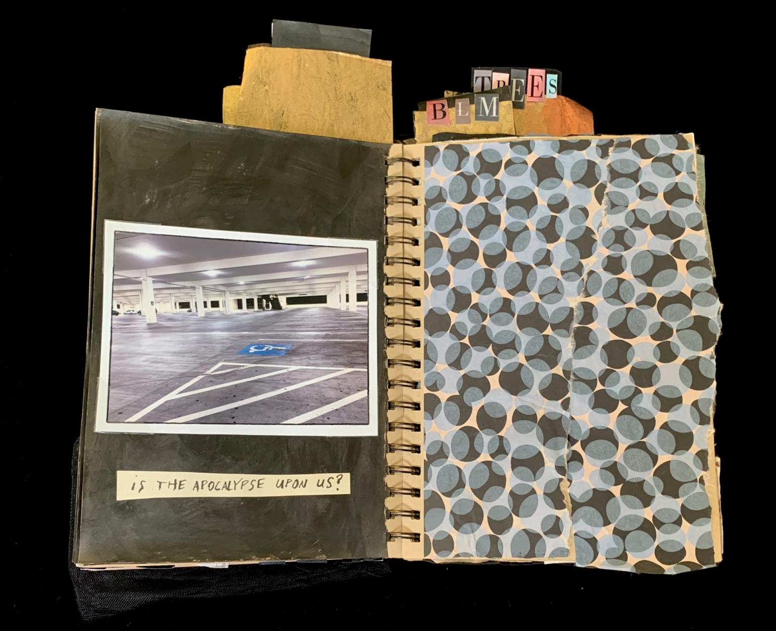 - The page is part of a scrapbook or art journal. On the left side, there is a photograph of an empty parking garage with a handicap parking space marked. Below the photo, handwritten text reads, "IS THE APOCALYPSE UPON US?" The right side of the page is covered with a patterned paper featuring a repeating geometric design in shades of blue and gray. At the top of the right side, the letters "BLM" are arranged in block letters, with "BLM" in black and "TTPES" in pink and blue.