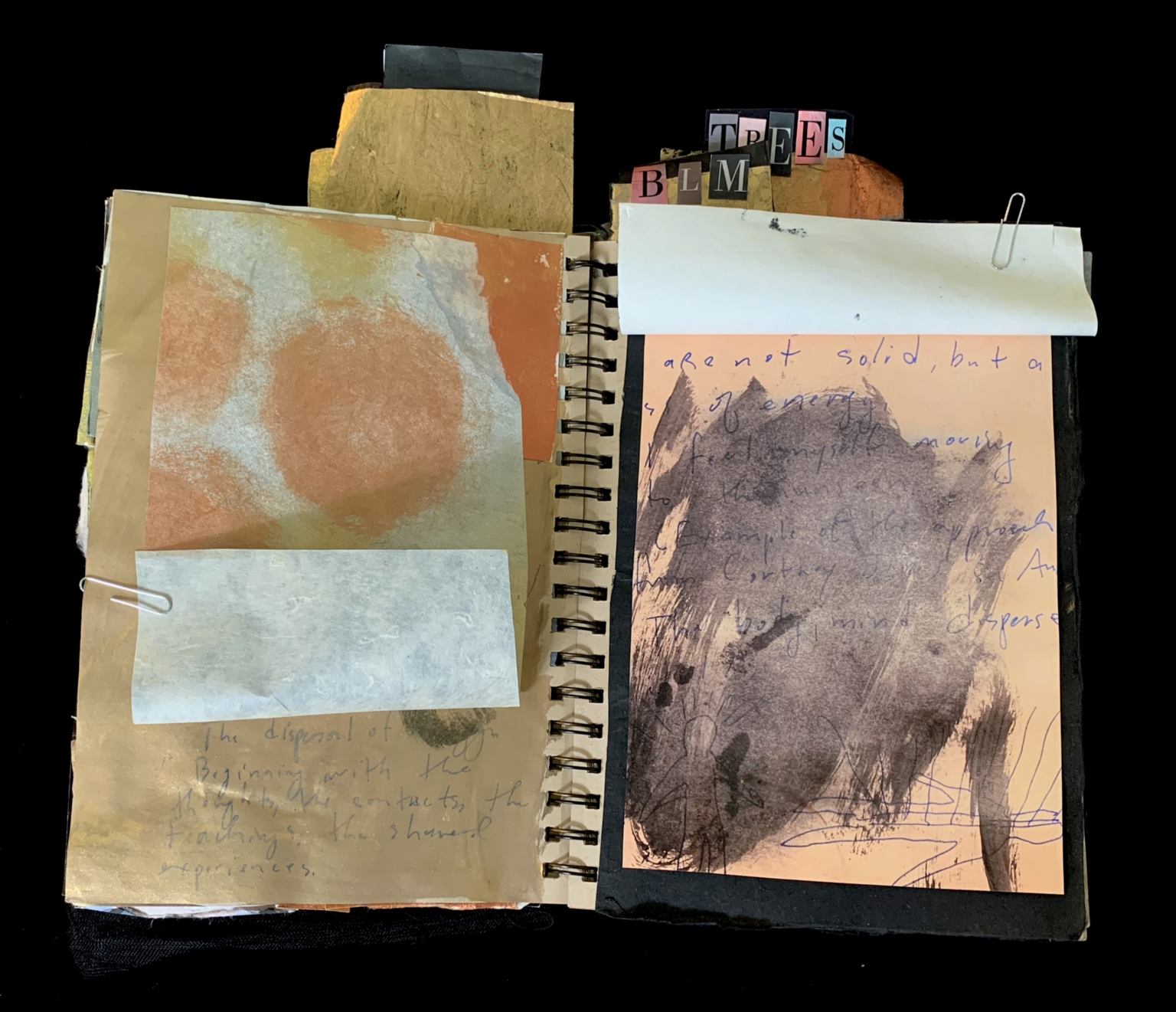 - The image showcases a creative collage on a spiral-bound notebook. The left side contains abstract art with muted colors and textures, including a large orange circle and a grayish-blue rectangle. The right side features a piece of paper with a dark, abstract drawing and handwritten text. The top right corner displays the letters "TREES BLM" in various colored blocks. The overall composition is layered and textured, with a mix of paper, paint, and possibly ink.