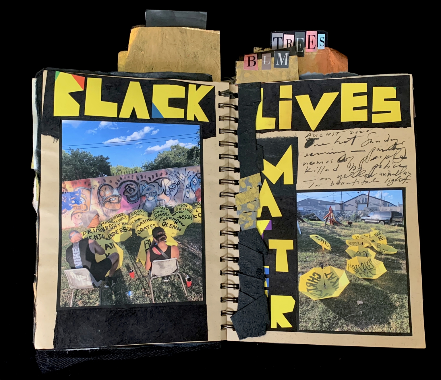 - The page is a collage with various elements. On the left side, there is a photograph of people holding signs with names and messages, possibly during a protest or demonstration. The signs are yellow with black text. The right side shows another photograph of a grassy area with yellow signs, some of which have names and messages written on them. The top of the page has bold yellow text reading "BLACK LIVES MATTER" and smaller text that reads "TREES BLM." There are also some handwritten notes on the right side of the page.