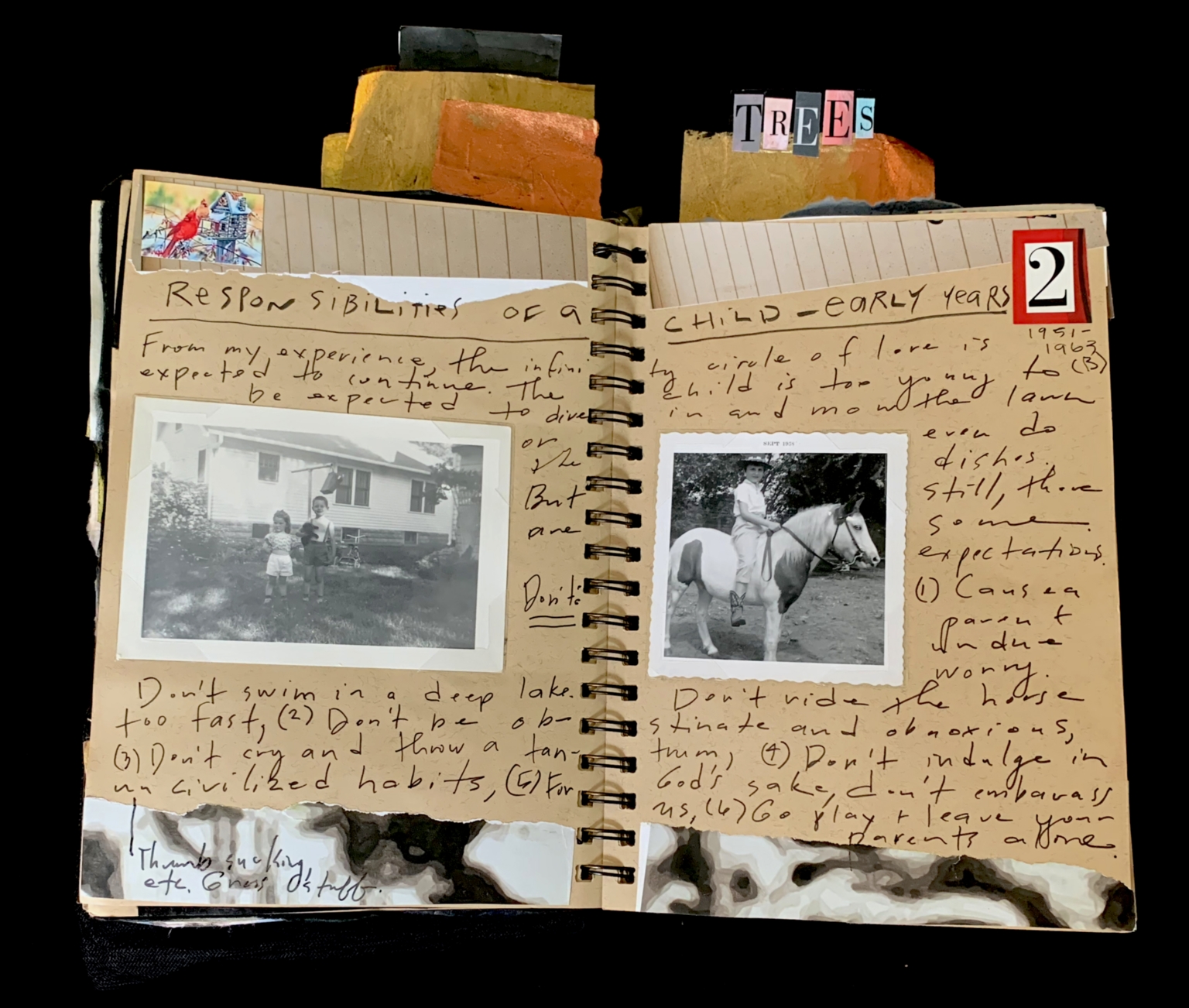 - The page is part of a scrapbook with a black background. At the top, there is a small, colorful structure resembling a treehouse made of stacked blocks. The page is divided into two sections. On the left, there is a black-and-white photograph of two children standing in front of a house. On the right, there is another black-and-white photograph of a person riding a horse. The page is filled with handwritten notes, some of which are crossed out, and there are decorative elements such as the word "TREES" made of small, colorful blocks at the top right corner. The page is bound with metal rings.