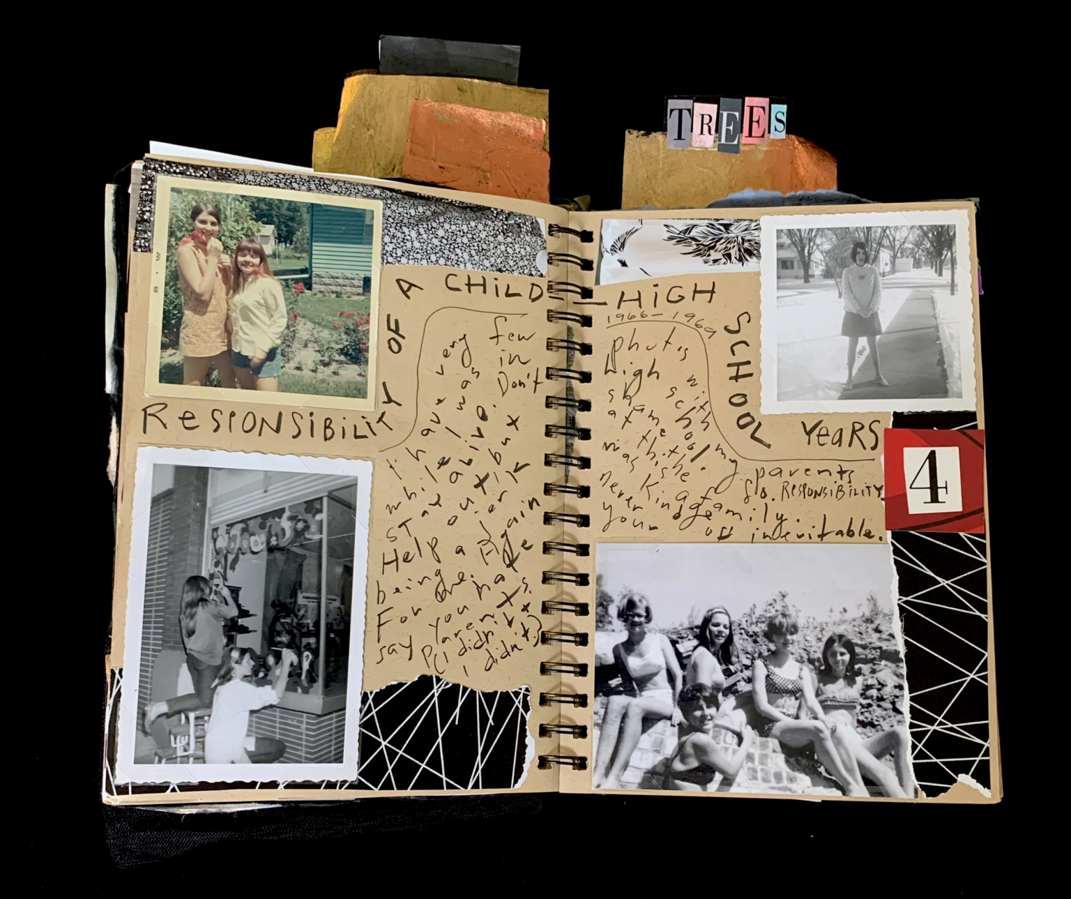 - Tangled wires; Woodpecker; Trees; Beauty; Destruction of nature; Parent-child responsibilities; Let Me Walk in Beauty; Lakota Sioux; Chief Yellow Lark; Public Parks; Trust for Public Land; Creative process; Flowers; Loss; Black veil collage; Covid-19; Candy Dickenson Becher; Drop metaphor; Gretchen Dykstra; Double mastectomy; Dream of parents; Breast cancer; God laughs at plans; 29 Pieces planning; Cardinals; Cardinal collages; Sibyl Dana Reynolds; Institutional breakdowns; BLM; BLM collage; Parental meditations; Potatoes and pride; Life stages; Gretchen’s kimono; Friendships; Past and present; Neighbor tree dispute; Manifest or dissolve; Contagious grace; Commodification of beauty