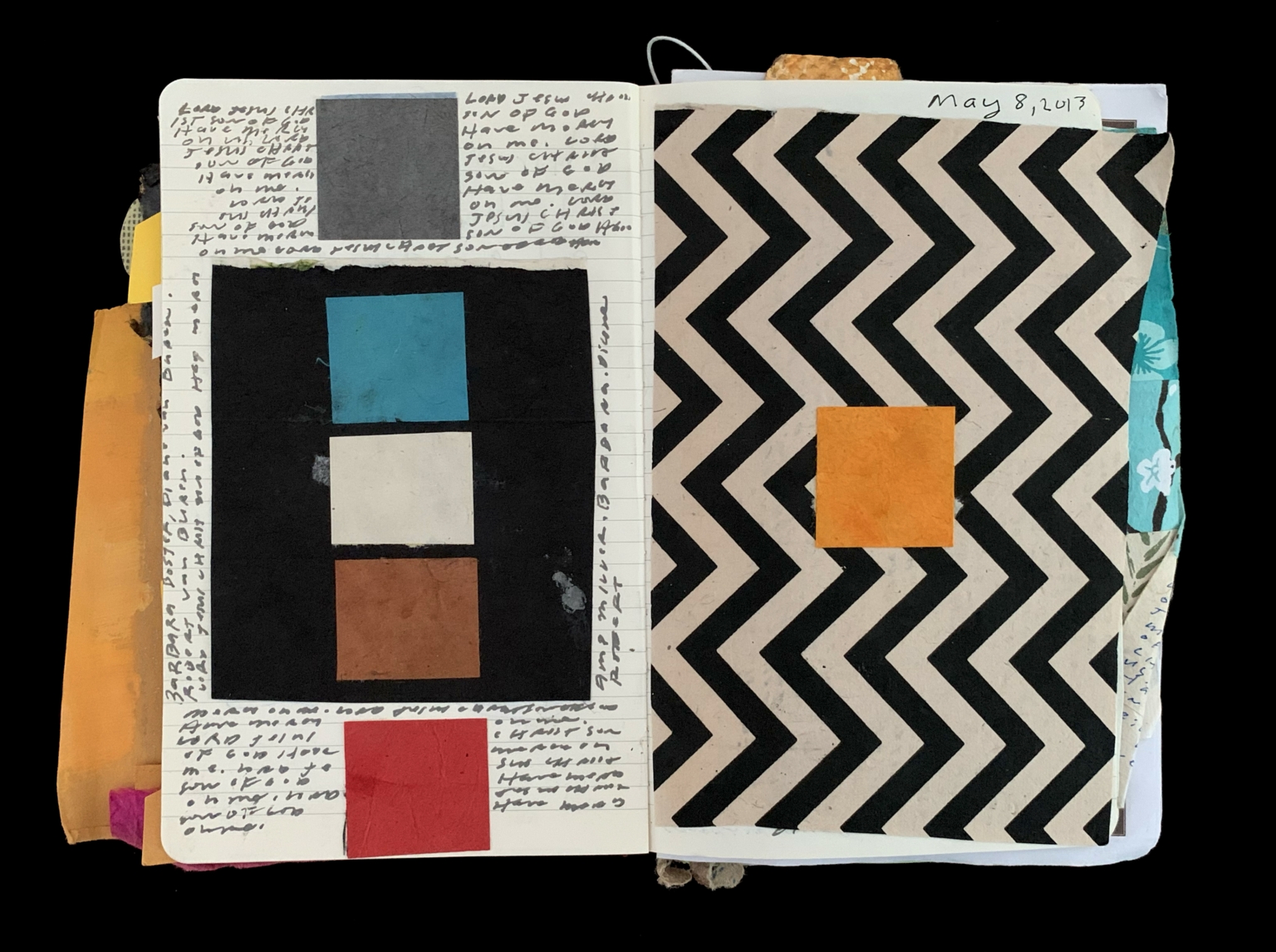 - The image shows an open notebook with two pages featuring different designs and text. The left page has a collage of rectangles in a vertical arrangement on a black background: a blue rectangle at the top, followed by white, brown, and red rectangles. Handwritten notes in a small, neat script surround the collage on the top, left, and bottom edges. The right page features a zigzag pattern of alternating black and white stripes with an orange rectangle pasted in the center. The upper right corner is labeled with the handwritten date "May 8, 2013."