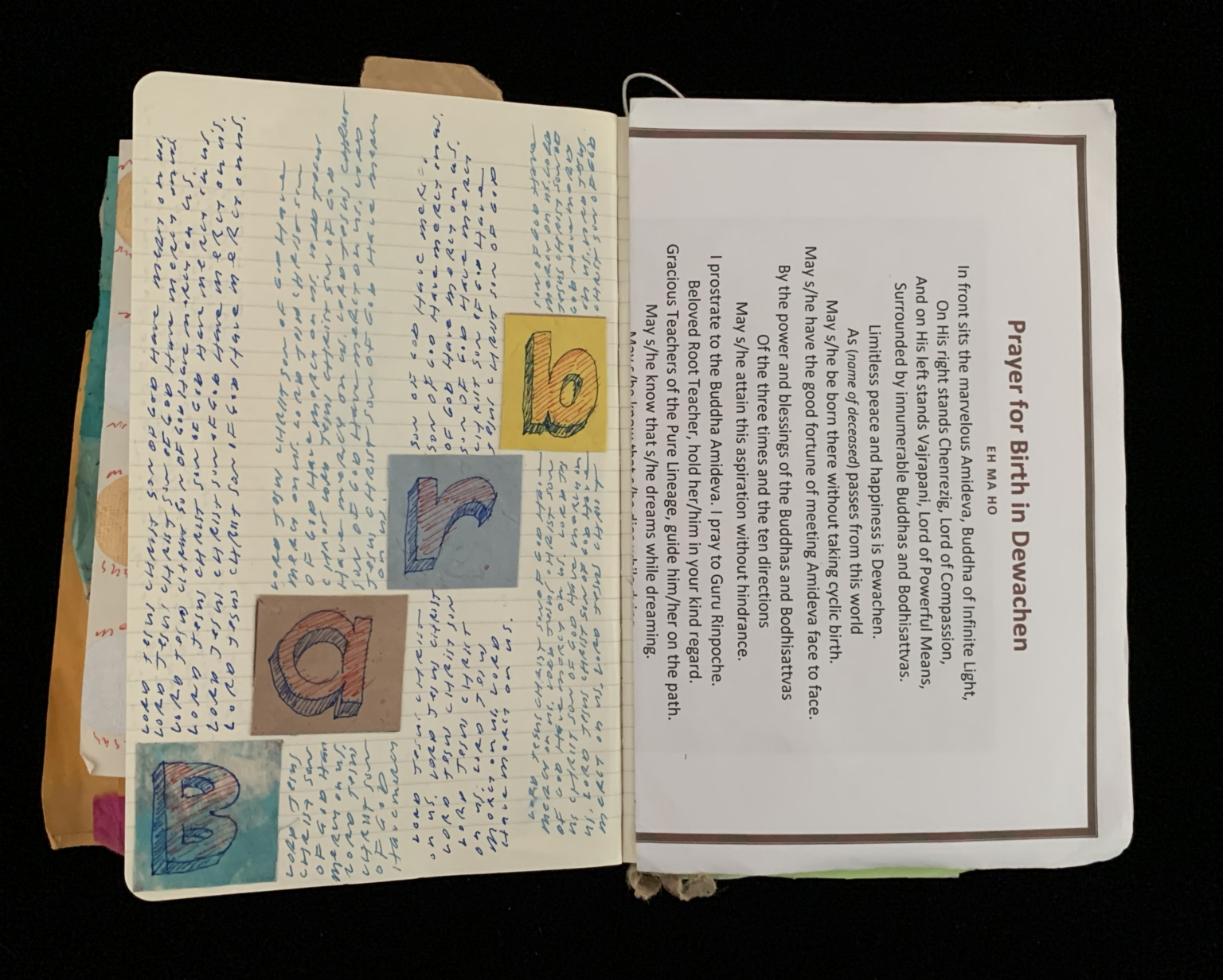 - The image shows an open notebook with handwritten text on both pages. The left page contains blue cursive handwriting filling the entire sheet, with sections divided by four colored squares each containing a letter. The letters are drawn in a bold, stylized font. From top to bottom, the letters are "b," "a," "r," and "B." The background of each square varies in color: yellow, light blue, brown, and blue respectively. The right page features a printed text titled "Prayer for Birth in Dewachen," surrounded by a gray border. The text is typewritten in black and brown fonts.