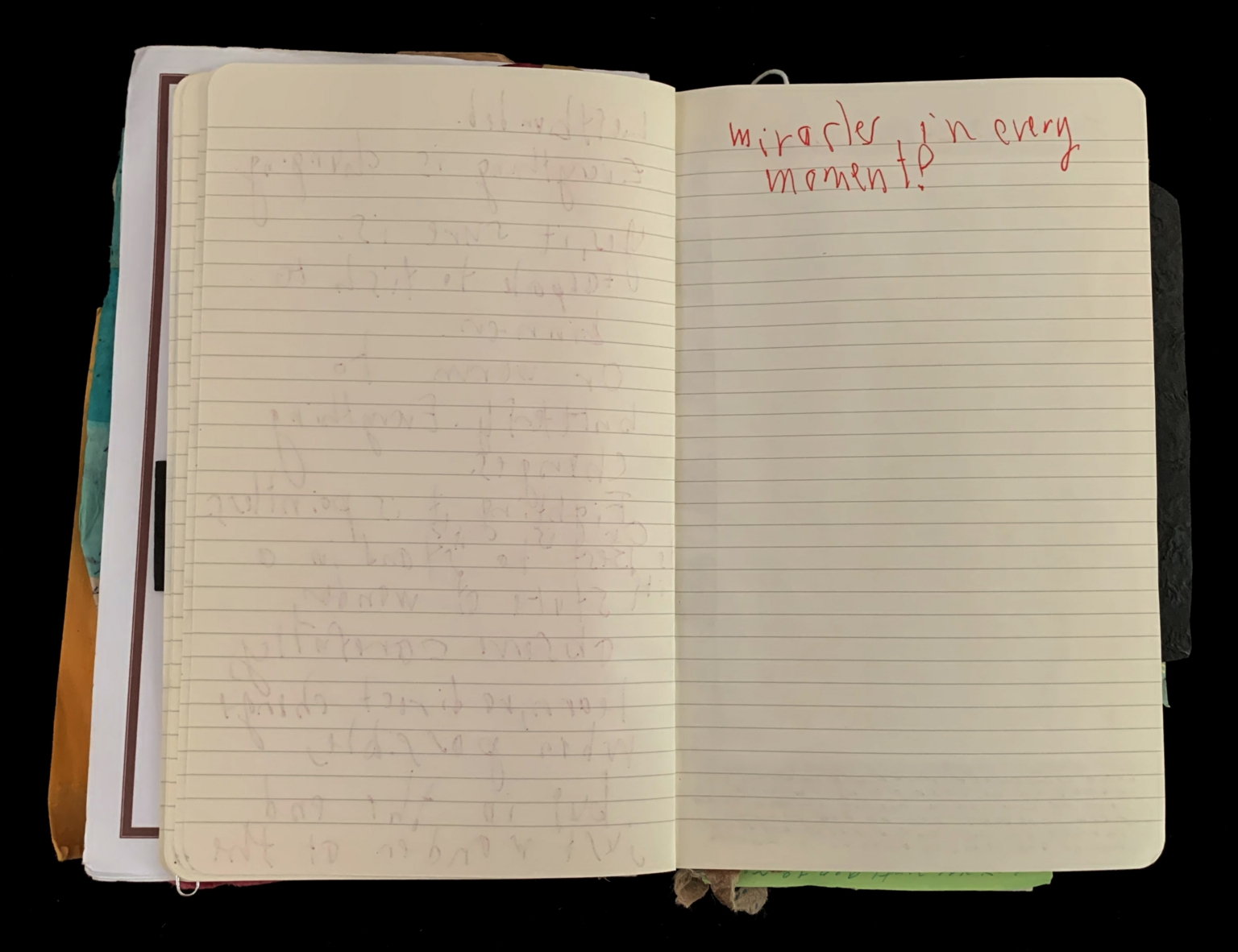 - The image shows an open notebook with lined pages. The left page appears to have faint, indecipherable writing, while the right page contains the words "Miracles in every moment!" written in red ink at the top. The notebook lies open against a black background, with some other papers or notebooks partially visible underneath the open pages.