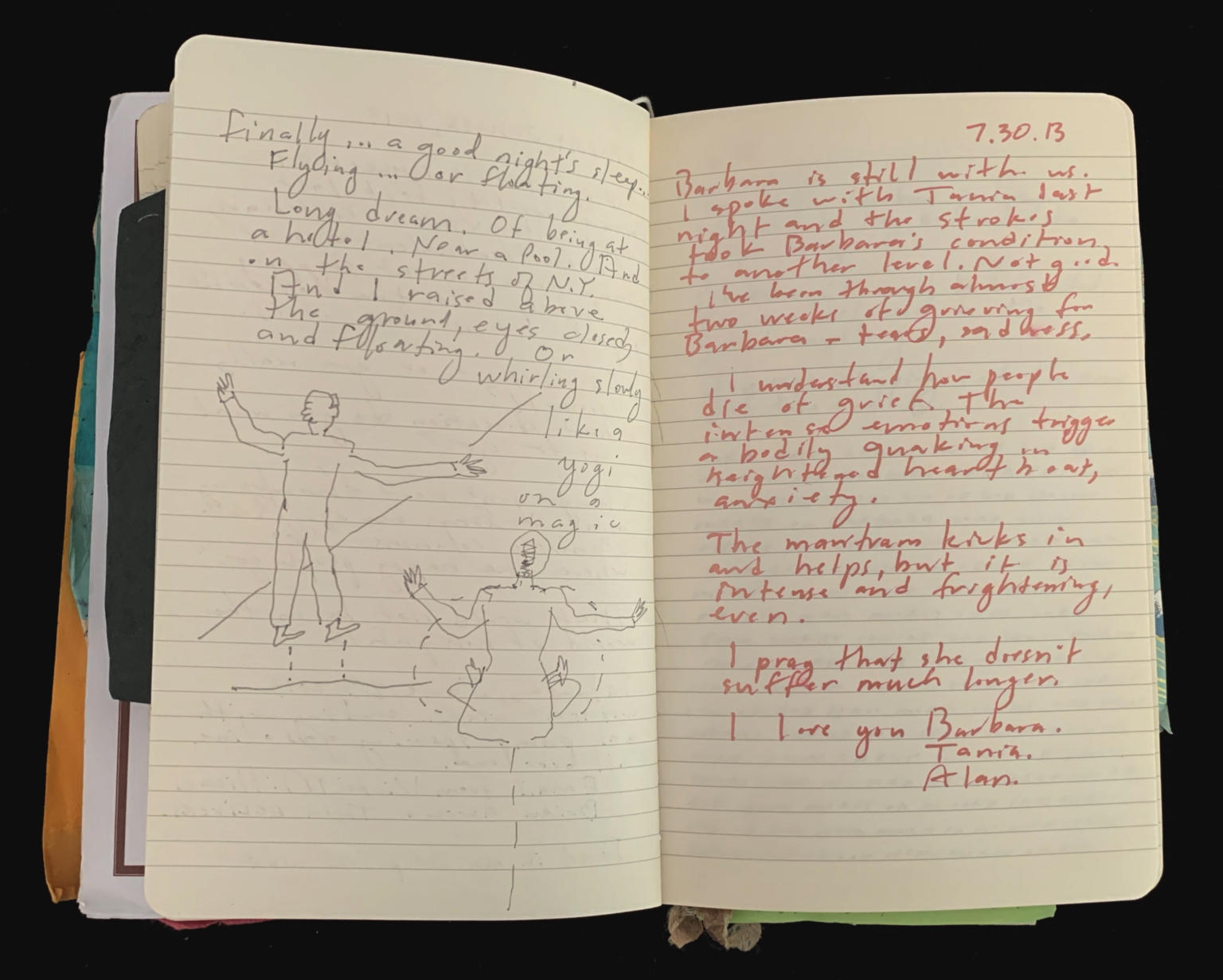 Right Page: "7.30.13 Barbara is still with us. Spoke with Tamra last night, and the strokes took Barbara's condition to another level. Not good. We have through almost two weeks of grieving for Barbara - tears, sadness, and understanding how people die. Then, I give this intensity to emotions, triggers in body, quickening heartbeats, heart beats out, and anxiety. The mantra kicks in and helps, but it is intense and frightening even. I pray that she doesnt suffer much longer. I love you, Barbara. Tamra. Alan." - Rights