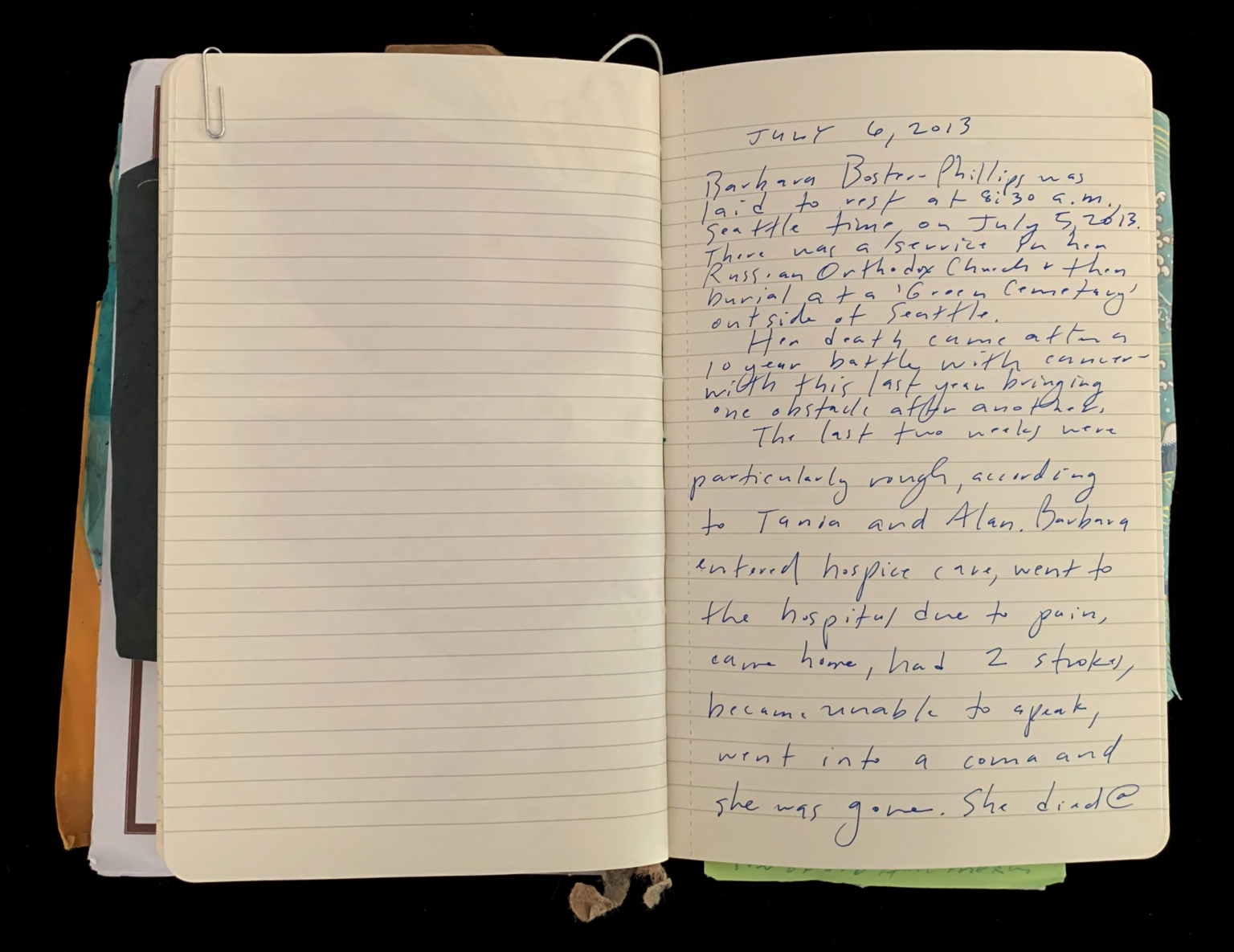 - 2013 journals; Yellow book; Orange book; Mantram book; Editorial ideas; Standing in awe; Will Richey; DaVerse Lounge; Barbara Boster Phillips; End-of-life; Soul sister; July 4 death; Mantrams for Barbara; Jeff Marxen; Childhood friend; Broken neck; Death; Corporate board; Matt Asche; Columbus NE; Grace in death; Meditation; Everything is changing; Moment miracles; Flat grief; Goodbye Barbara; Illustration agent; Seattle; Great mystery; Freedom in death; Dramatic exit; Reluctant But Obedient Servant; Dallas LOVE Project; Bad board meeting; Prayers; Tania Boster; Alan Phillips; Jason Reynolds; Flying dream; Grief