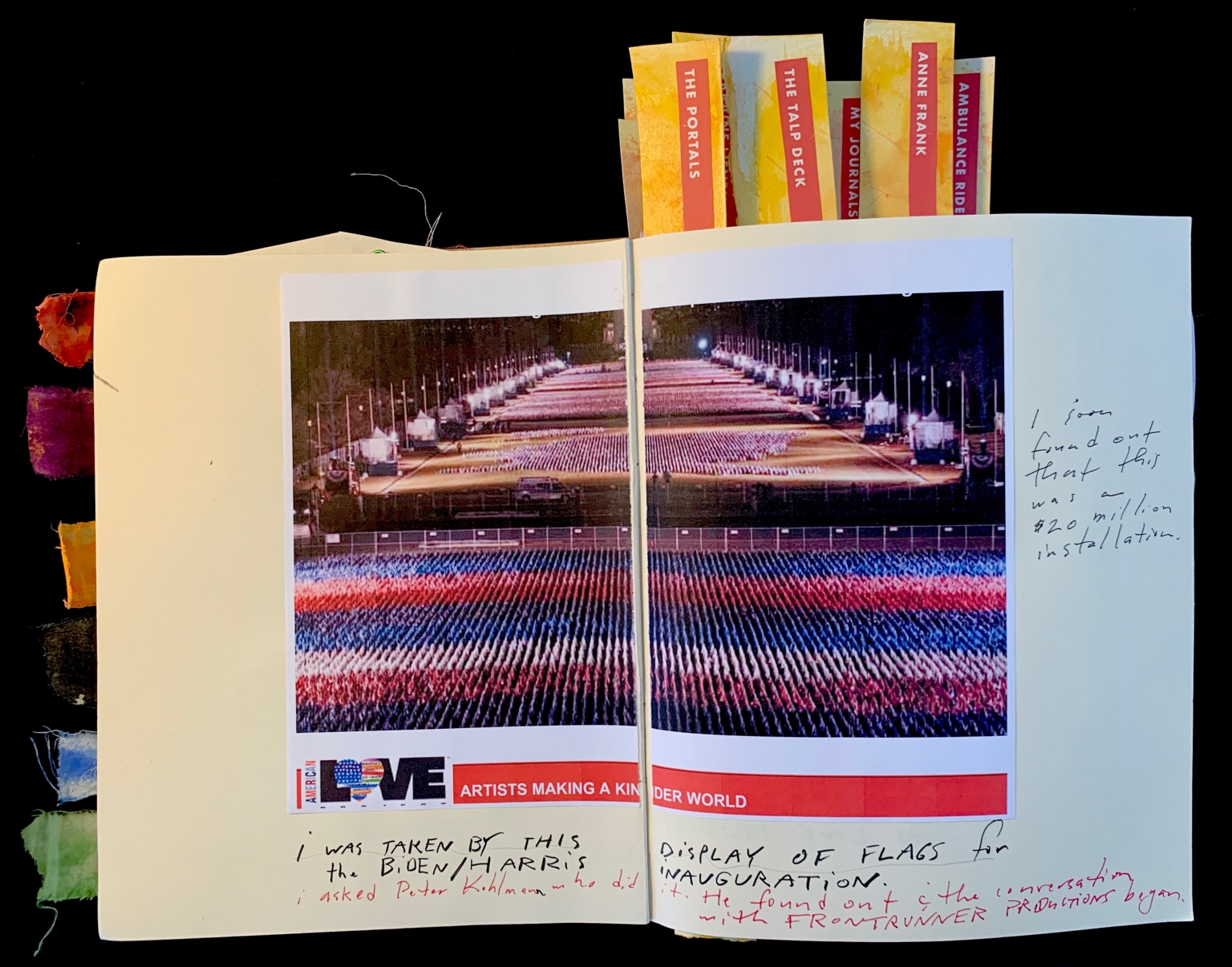 - The image shows a journal spread containing an artwork and handwritten notes. Across both pages, there is a photograph depicting a large-scale display of flags arranged in an orderly pattern on a field at night, with lights illuminating the scene. Below the picture is a graphic with the word "LOVE," incorporating a rainbow color scheme, and the phrase "ARTISTS MAKING A KINDER WORLD" in bold uppercase lettering on a red background. Handwritten text is present at the bottom and along the side of the pages. Several colored tags protrude from the top of the pages, labeled with various titles like "THE PORTALS" and "ANNE FRANK."