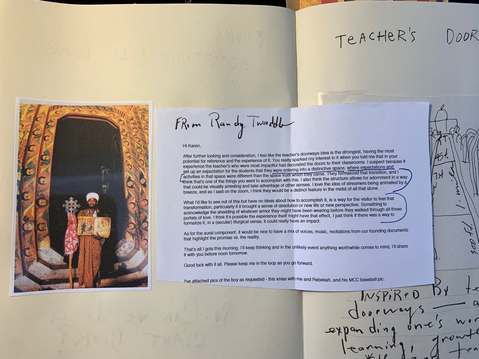 On the right side, there is a letter, printed and pasted into the journal, addressed to "Karen" from "Randy Twaddle". The letter discusses the concept of teacher's doorways in educational settings, mentioning ideas related to visual and aural components and transformative visitor experiences. There are blue ink annotations encircling some parts of the text.