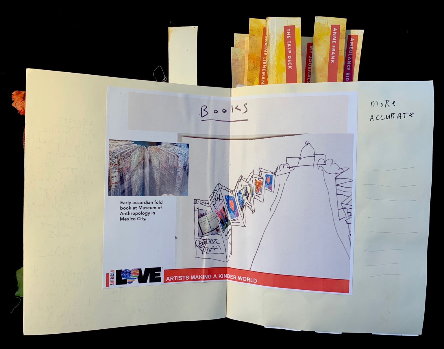 - The image shows an open journal with handwritten notes and artwork. The left page contains a pasted printed image of an accordion-fold book displayed at the Museum of Anthropology in Mexico City. Below this image is a text label and a graphic with the word "LOVE" featuring different colors and patterns, along with the phrase "ARTISTS MAKING A KINDER WORLD" on a red stripe. The right page has an illustration depicting a figure holding a line of hanging framed pictures. Above the illustration, the word "BOOKS" is handwritten. To the right of the illustration, handwritten text reads "MORE ACCURATE." Five colored tabs are visible protruding from the top of the journal, labeled: "THE TALP DECK," "ANNE FRANK," "MY JOURNALS," and "AMBULANCE RIDE."