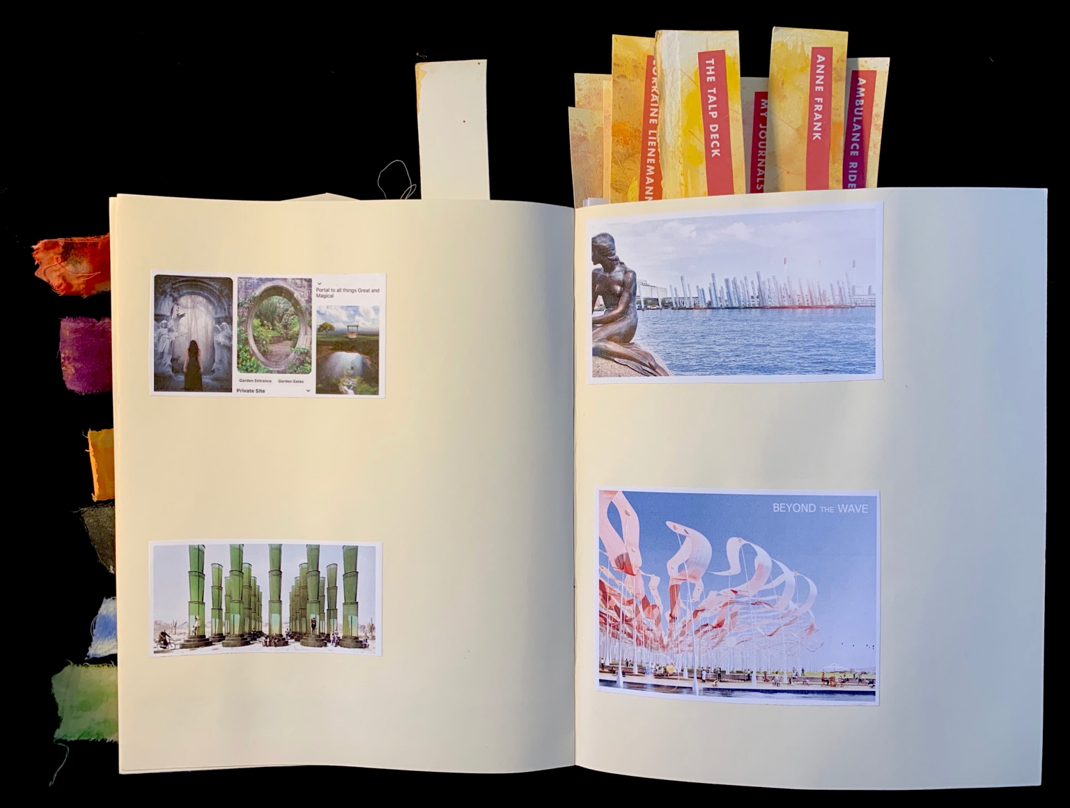 - The image displays an open journal with two visible pages. The left page features a collage of images and artwork, including three small photographs at the top depicting scenic landscapes and a larger architectural illustration at the bottom, showing tall cylindrical structures resembling bamboo. The right page contains two large photographs. The top image shows a statue of a seated figure by the ocean, with a cityscape in the background. Below that, there's an image titled “Beyond the Wave,” showing an art installation of wavy structures against a clear sky. Several colorful tabs are inserted across the top of the journal, labeled with various names and topics. There are also textured fabric swatches in multiple colors along the left edge of the left page.