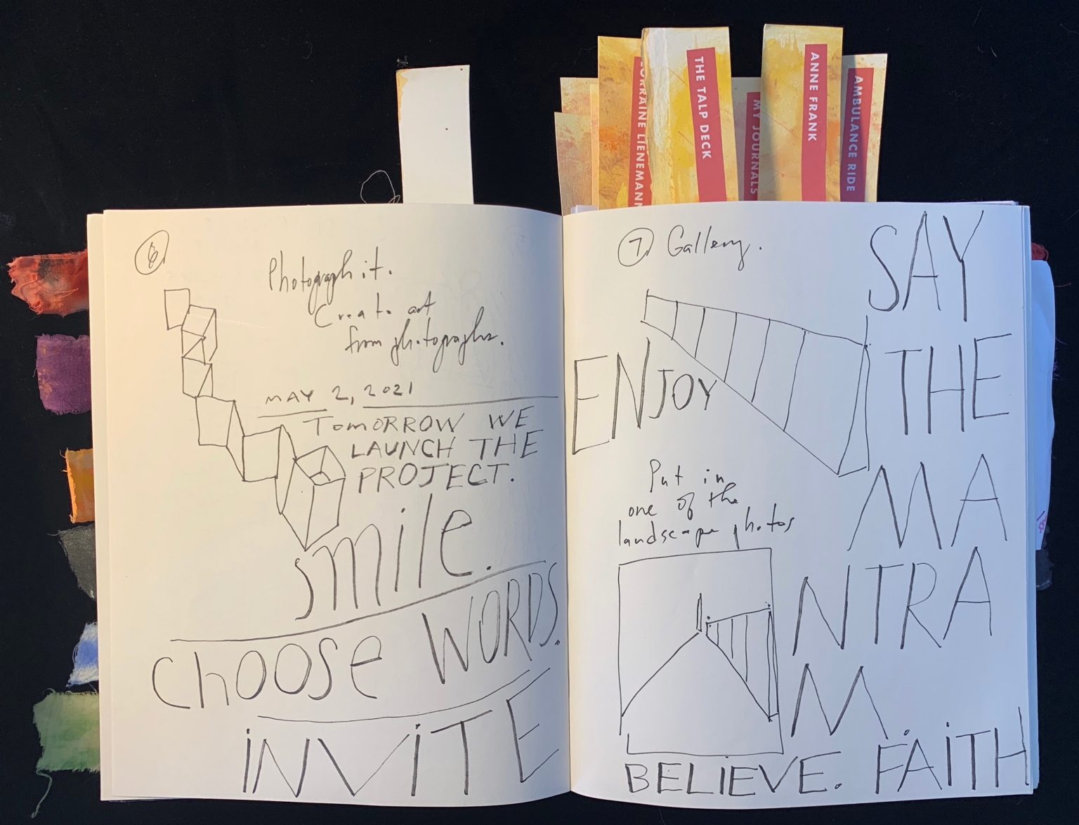 - The image shows a journal open to two pages containing handwritten text and sketches. The journal is laid upon a black surface, with colorful fabric tabs visible along the left edge. The left page features sketches of cubes and handwritten notes, including the date "May 2, 2021." The right page has a sketch of a triangular shape and several words in large letters. Above the journal, several bookmarks protrude with text that appears to be titles.