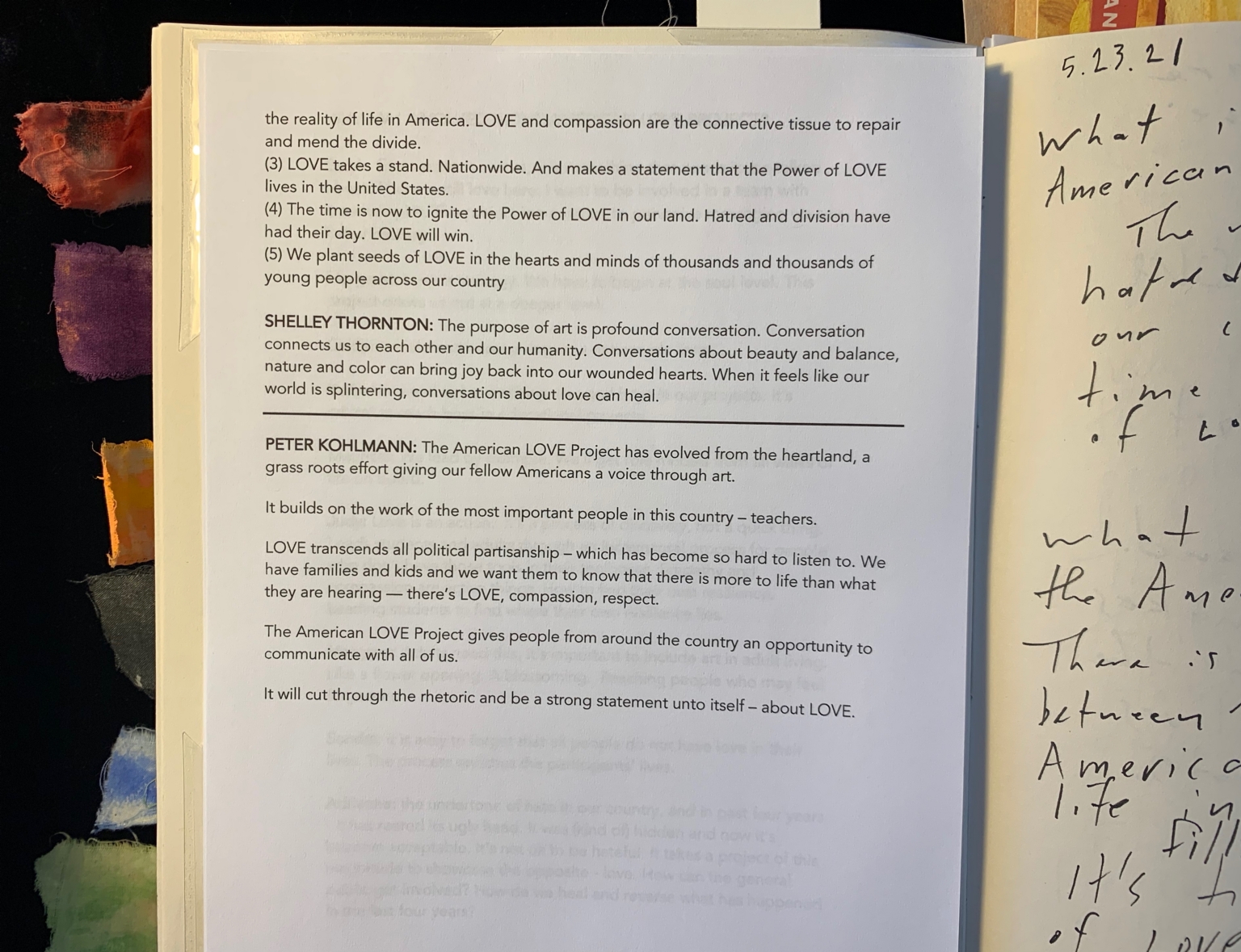 - The image portrays an open journal resting on a flat surface. On the left side, a page printed with text is visible, featuring a combination of paragraphs and highlighted quotes. The text is primarily focused on themes of love, compassion, and unity, containing names and statements from specific individuals. The page is bordered by fabric or paper swatches in various colors such as red, orange, and green. On the right side, a handwritten page displays text in English, with a date at the top reading "5.23.21." The handwriting is slightly slanted, with phrases speaking about American life and emotions. The background is lightly colored, with some shadows and text partially visible.