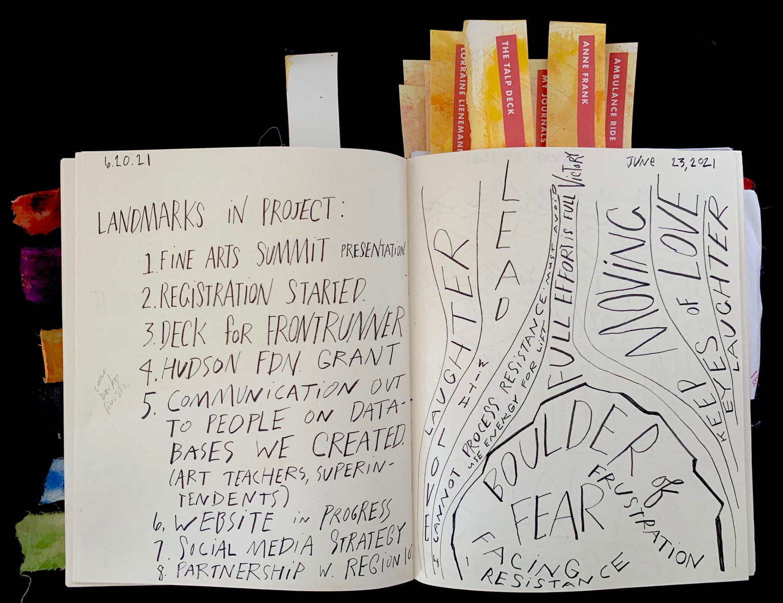 - The image depicts an open journal with two pages visible. The left page has structured handwritten text titled "Landmarks in Project:" with a list numbered one to eight, detailing project steps and milestones. The right page features freeform, artistic text layout with large words and phrases written in various directions, resembling a mind map or conceptual diagram. The phrases are creatively scattered across the page with varying text sizes. Five colorful tabs are visible sticking out from the top of the journal and are labeled with words.