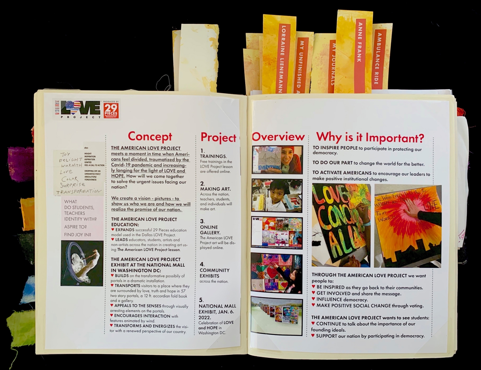 - The image shows an open journal with two pages filled with typed and handwritten content. The pages include sections labeled "Concept," "Project," "Overview," and "Why is it Important?" The left page focuses on "Concept" and "Project" details, featuring a handwritten note with words like "Joy," "Delight," and "Transformation." The right page contains a section titled "Why is it Important?" with bullet points and squares containing photographs. The images show students and artwork with colorful designs and messages. The journal has multiple tabs labeled with different titles like "Lorraine Lienemann," "My Journals," and "Ambulance Ride."
