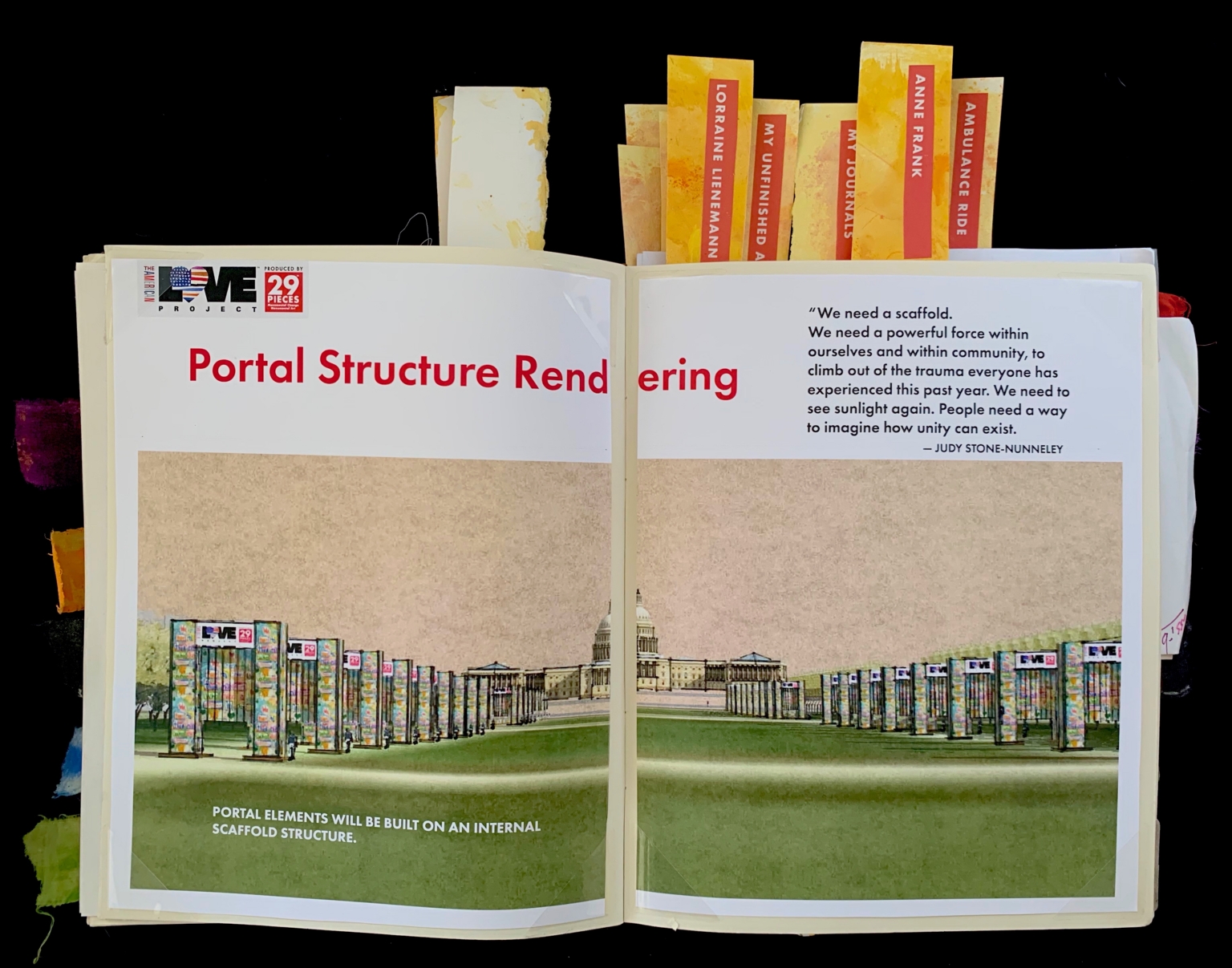 The right page contains a quote from Judy Stone-Nunneley. Above the quote is part of the text "Rendering" from the left page, integrated into the design, with the right column of the page featuring the full quote in black text. The backdrop is a continuation of the left-page artwork, showing more portal structures with the capitol in the distance. Colorful page markers can be seen sticking out from the top of the journal, labeled with names and phrases, such as "LORRAINE LIENEMANN" and "ANNE FRANK." - Identifier