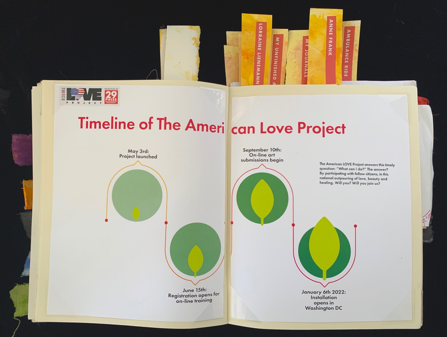 - The image shows an open journal featuring a timeline for "The American Love Project." The page on the left displays two green circles with leaf illustrations connected by a red line with text. The timeline markers include "May 3rd: Project launched" and "June 15th: Registration opens for on-line training." The right page continues the timeline with similar graphics and additional text. It includes "September 10th: On-line art submissions begin" and "January 6th 2022: Installation opens in Washington DC." Above the content, the project's title is printed in bold red letters. Several colorful tabs and paint swatches stick out from the top and side of the journal.