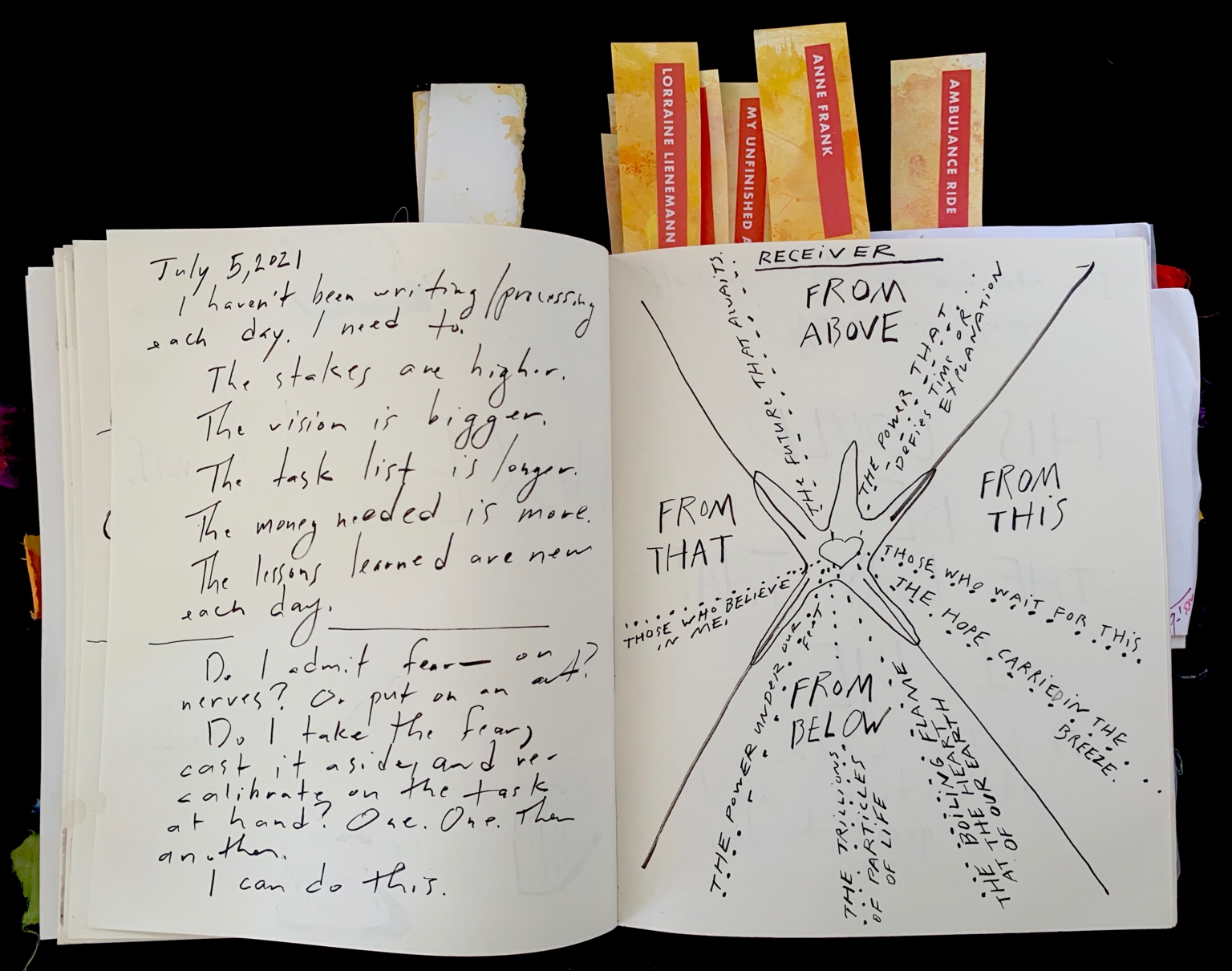 Left page: "July 5, 2021 I haven’t been writing / processing each day. I need to. The stakes are higher. The vision is bigger. The task list is longer. The money needed is more. The lessons learned are new each day. Do I admit fear — or nerves? Or put on an act? Do I take the fear, cast it aside, and re- calibrate on the task at hand? One. One. Then another. I can do this."