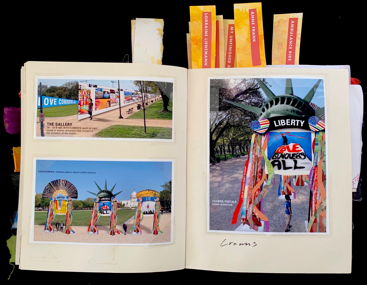 Colorful tabs protrude from the top of the journal, inscribed with labels such as "LORRAINE LIENEMANN," "ANNE FRANK," "MY UNFINISHED," and "AMBULANCE RIDE." The bottom of the right page includes the handwritten word "Crowns." - Identifier