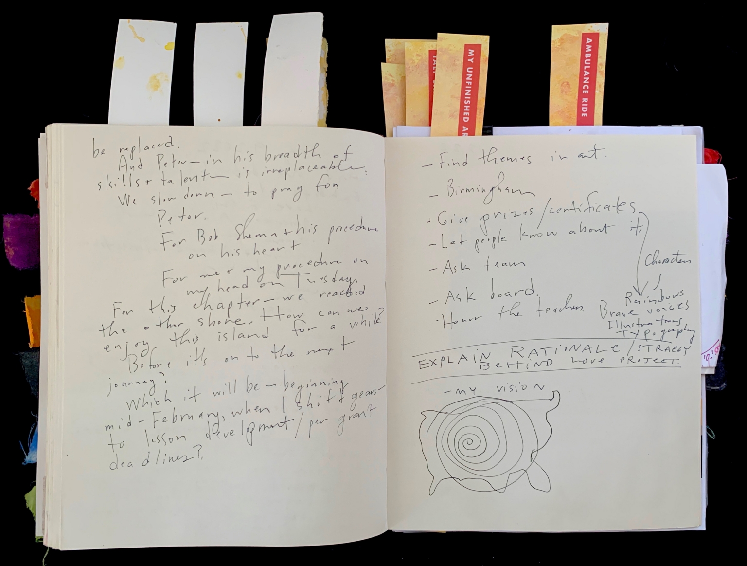- The image features an open journal displaying two pages filled with handwritten text and a spiral artwork. The left page contains densely written text in a cursive style. The text appears to be personal notes or reflections. The right page lists bullet points related to themes in art and other annotations. There are multiple phrases and words, with some underlined for emphasis. A hand-drawn spiral pattern is situated at the bottom, labeled "my vision." Sticky tabs are visible at the top of the journal, each with varying colors.