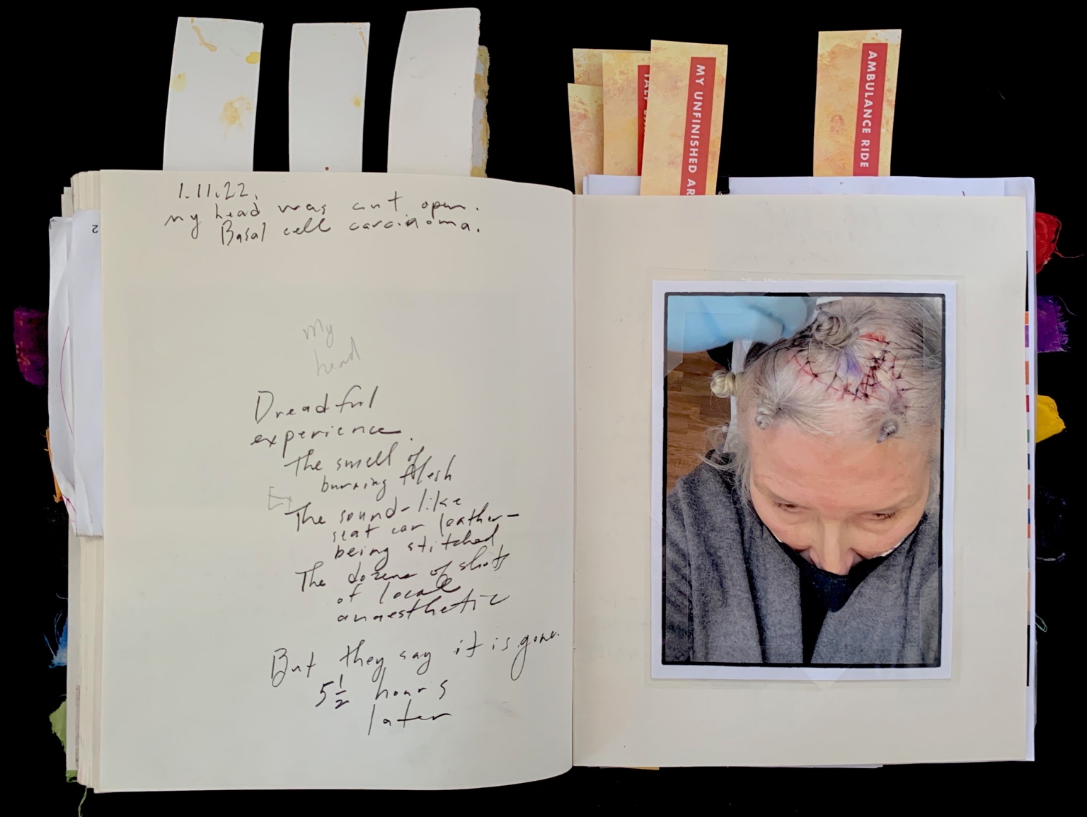 - The image displays an open journal with handwritten notes and an attached photograph on facing pages. The left page contains handwritten text in black ink, detailing an apparent medical experience and personal reflections. Several phrases and words are emphasized with different line weights and spacing. The right page holds a photograph showing the top of a woman's head with sutures on her scalp, indicating post-surgical care. Several colored tabs extend from the top and side edges of the journal, suggesting bookmarks or section dividers. The background is dark, highlighting the focused brightness of the open pages.