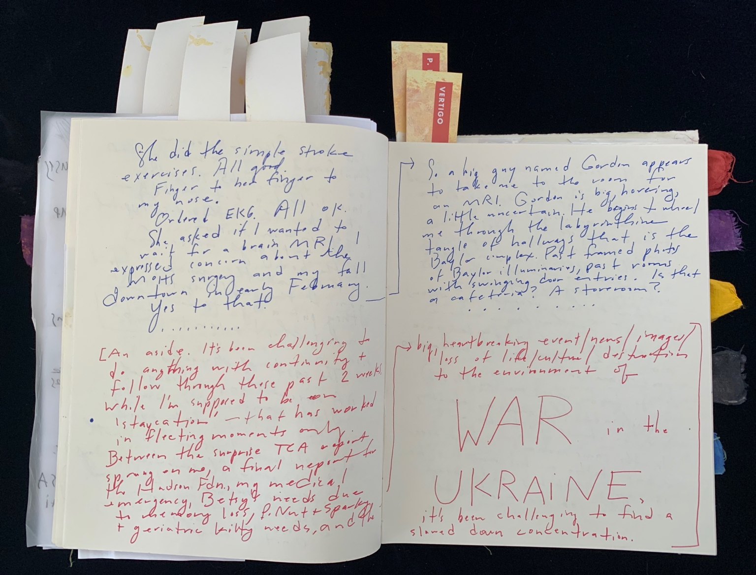 - The image depicts an open journal with pages filled with handwritten notes in blue and red ink. The page on the left contains notes in blue, discussing medical procedures and personal reflections, including stroke exercises and EKG results. Below the blue text, there is a red ink aside detailing personal challenges and events. A set of pages tagged with various colored sticky notes, including purple and orange, can be seen protruding from the top and side. The right page features a mixture of blue and red handwriting. The blue text talks about someone named Gordon and an experience with an MRI and hallway navigation. The red ink highlights the phrase "WAR in the UKRAINE" prominently, surrounded by reflections on global events affecting concentration. Brown tags with "VERTIGO" written on them are inserted at the top.