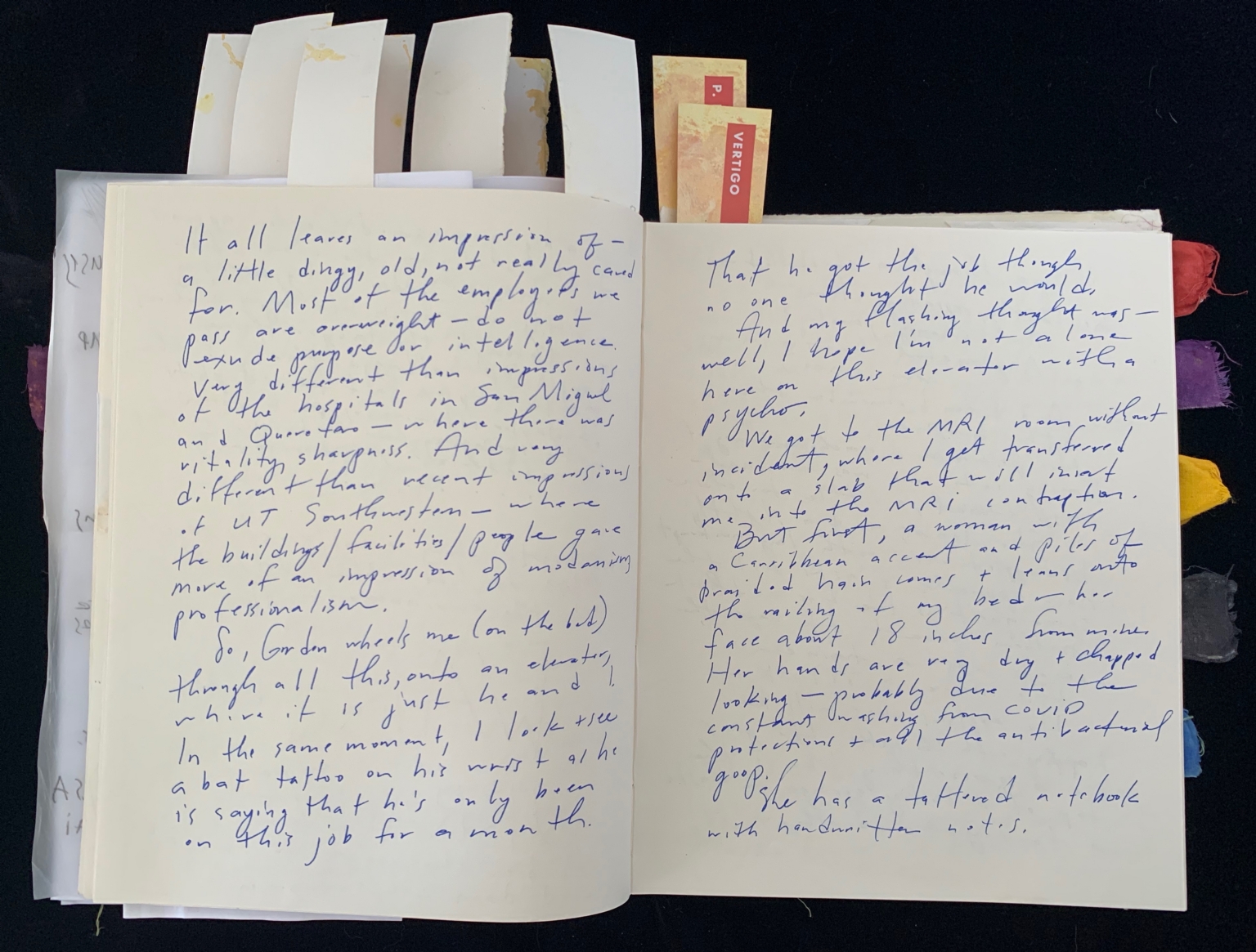 - The image shows an open journal with pages filled with handwritten text in blue ink. The journal has several smaller pieces of paper or notes sticking out at the top, each varying in color and slightly visible due to their overlapping arrangement. The top of the first page has clear handwriting, with more text continuing to the next page. The pages are set against a dark background, emphasizing the cream color of the paper in the journal. The notebook includes colored ribbon markers visible along the right edge, with hues including red, purple, and yellow.