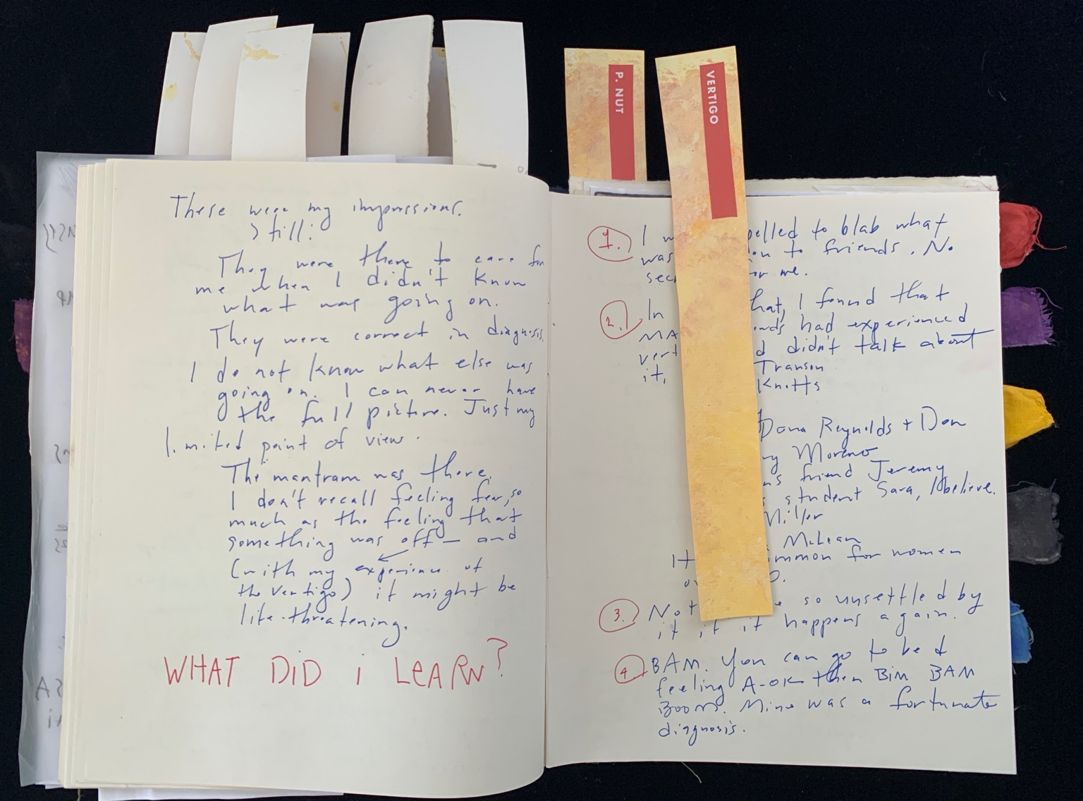 - The image shows an open journal with two pages filled with handwritten text in blue ink. The left page contains reflective writing with phrases like "They were correct in diagnosis" and "WHAT DID I LEARN?" written prominently in red ink at the bottom. The right page lists numbered points, also in blue ink, with two printed bookmarks labeled "P. NUT" and "VERTIGO" placed in the book. The edges of the pages have various colored tabs, including orange, red, purple, and dark blue, protruding, suggesting multiple sections.