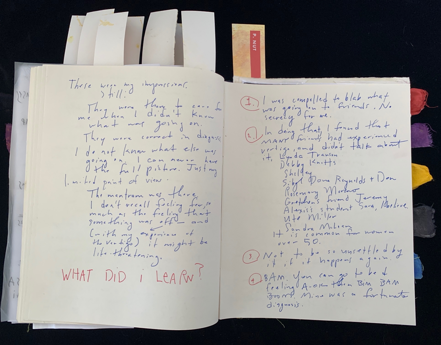 - The image shows an open journal with handwritten text on two visible pages. The left page contains text written in blue ink, starting with "These were my impressions" followed by additional reflections. A notable phrase at the bottom of this page is written in red ink, "WHAT DID I LEARN?" The right page features a numbered list in blue ink, with numbers circled in red. Four points are listed, discussing personal experiences and observations. The background is dark, highlighting the white pages. Additional pages can be seen underneath, marked with colored tabs in red, orange, yellow, purple, and black.
