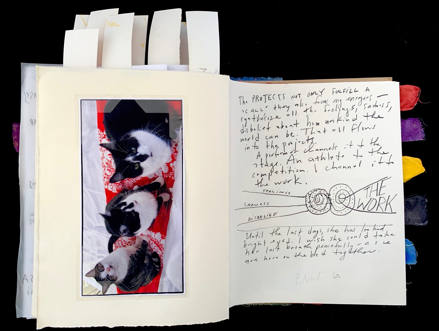 - The image shows an open journal with two pages visible. The left page features a photograph of three cats sitting on a patterned red and white surface. The page itself is cream-colored, and the photograph is centered, bordered by a thin gray line, and held in place by tape at the corners. The right page contains handwritten text in black ink on white paper. The writing is slightly slanted and includes a small illustration at the bottom featuring abstract circles with the words "THE WORK" to the right. Several colored fabric tabs protrude from the right edge of the journal, including red, purple, blue, yellow, and black tabs.