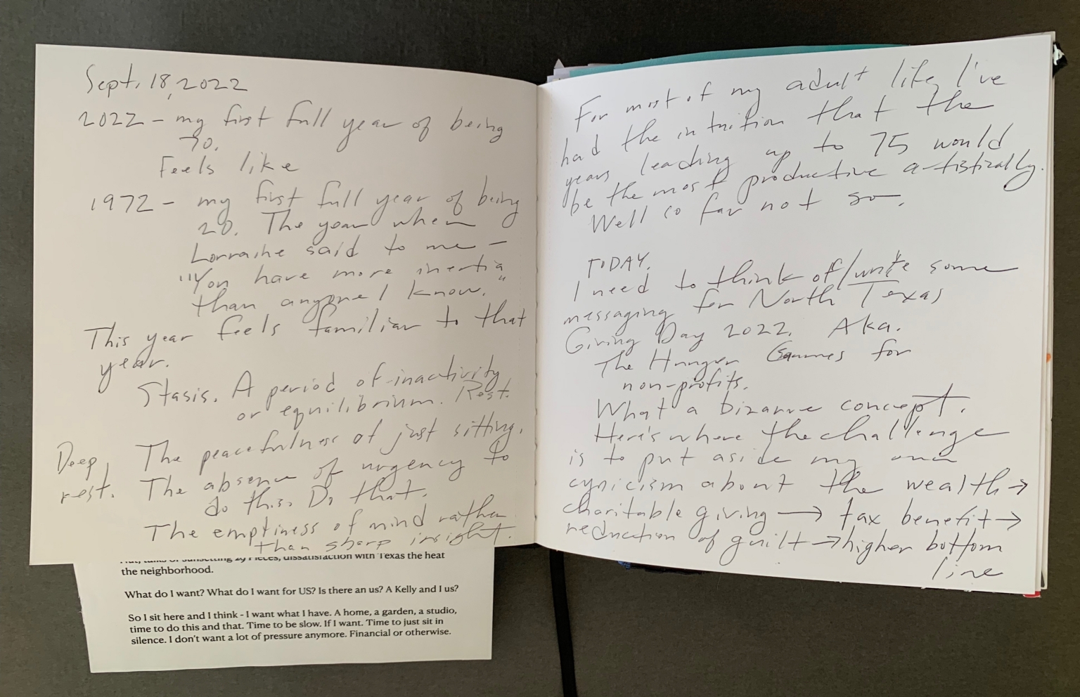 - Visual journal; Photographs; 2022; Deep rest; American LOVE Project; 29 Pieces; Sundown plans; Reinvigoration; This Moment in Time; Timeline; Loose ends; Original vision; Artists Making a Kinder World; Curriculum; Brandon Woodard; Prison; THIS OR THAT; IF THIS THEN THAT; Dhammapada; Eknath Easwaran; Meditation; Kelly’s mother; Grief; Anxiety; Summer heat; Garden loss; Nervous breakdown; Fort Worth; Hotel retreat; Art museums; Botanical garden; Construction noise; Emotional overwhelm; Daily choices; Goya; Beatrix Potter; Hokusai; Rico Lebrun; Future direction; Circumstantial clarity