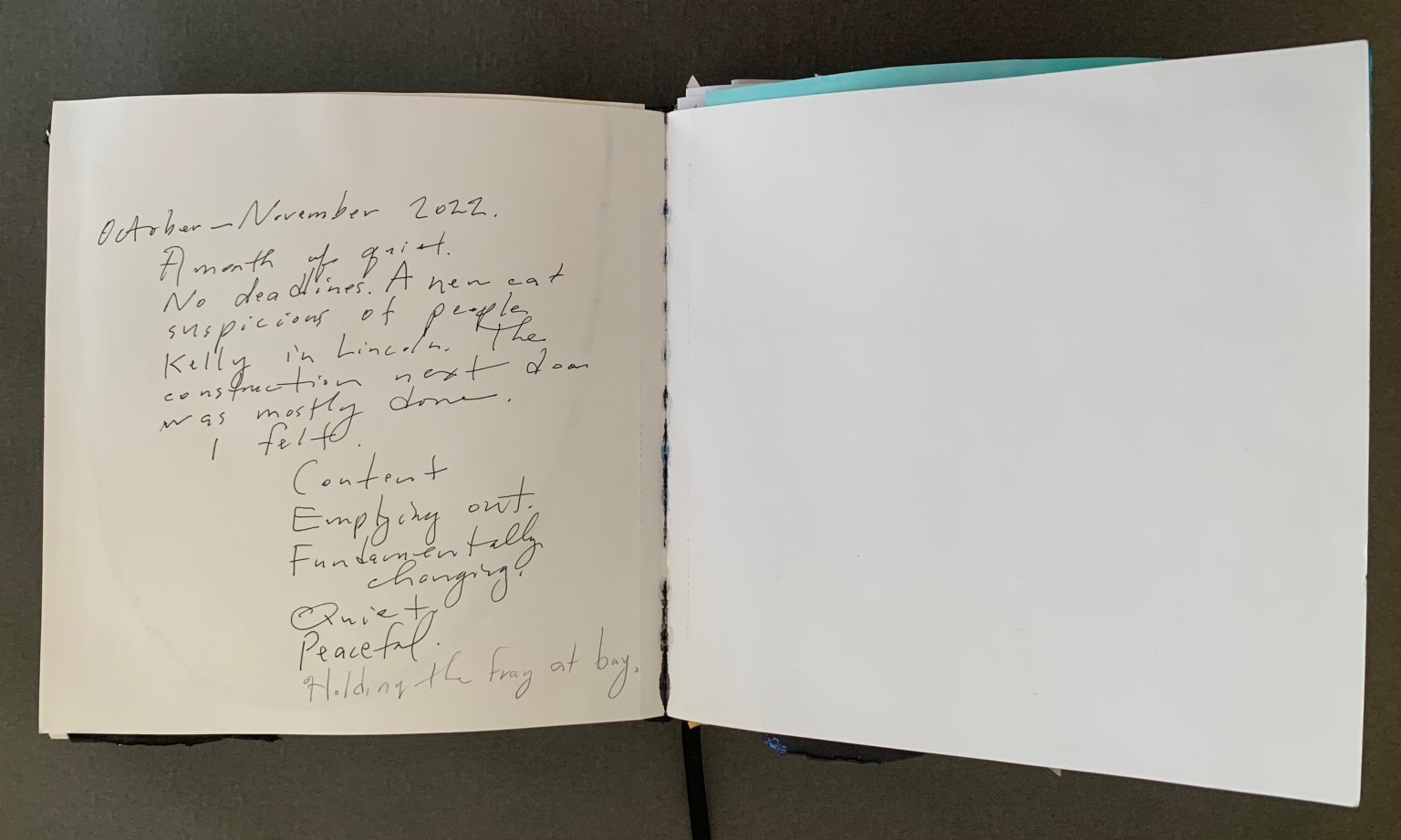 - Visual journal; Photographs; 2022; Deep rest; American LOVE Project; 29 Pieces; Sundown plans; Reinvigoration; This Moment in Time; Timeline; Loose ends; Original vision; Artists Making a Kinder World; Curriculum; Brandon Woodard; Prison; THIS OR THAT; IF THIS THEN THAT; Dhammapada; Eknath Easwaran; Meditation; Kelly’s mother; Grief; Anxiety; Summer heat; Garden loss; Nervous breakdown; Fort Worth; Hotel retreat; Art museums; Botanical garden; Construction noise; Emotional overwhelm; Daily choices; Goya; Beatrix Potter; Hokusai; Rico Lebrun; Future direction; Circumstantial clarity