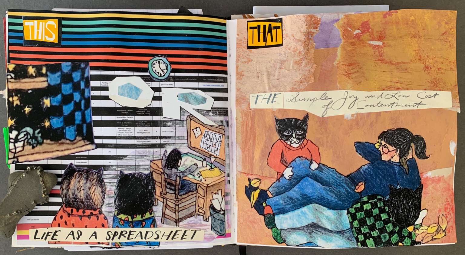 The left page features a collage with a black and white striped background. It includes a drawing of a person sitting at a desk with a computer, surrounded by various doodles and cutouts, including a blue and black checkered pattern, a starry night sky, and a circular emblem. The bottom of this page has the text "Life as a Spreadsheet" in a yellow banner.