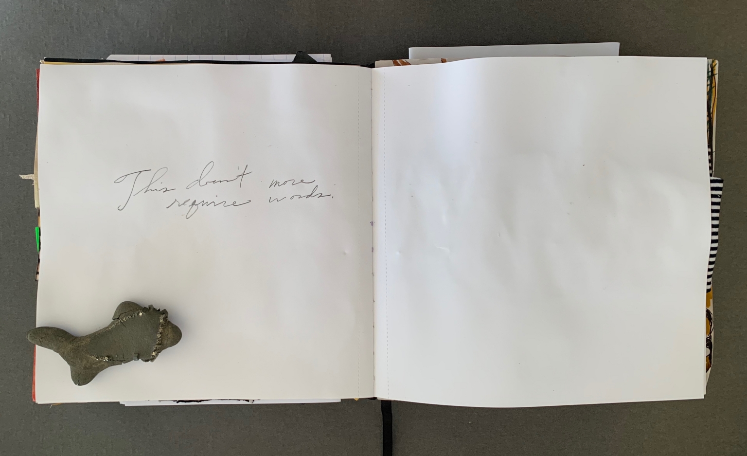 - The page features a small, gray, textured sculpture resembling a fish or a similar creature placed on the left side. The right side of the page is blank. The left side contains handwritten text that reads, "This don't need more words."