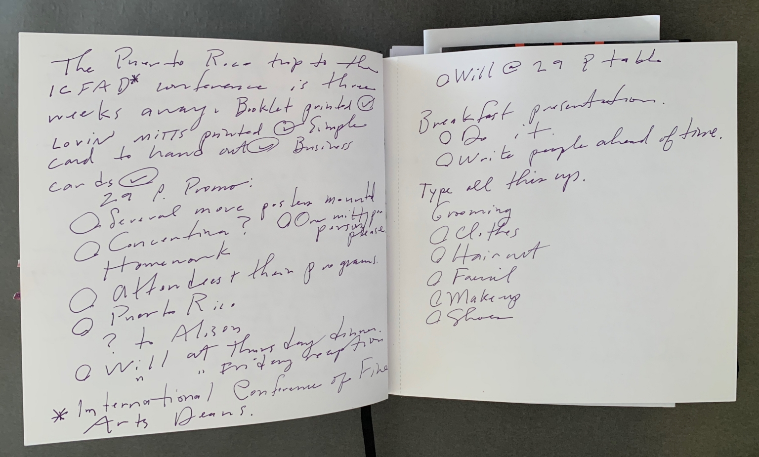 - The image shows two pages of a handwritten journal. The left page contains a detailed list of tasks and notes related to a trip to Puerto Rico, including mentions of the ICFAD* conference, business cards, and personal items like clothes and hairnet. The right page lists tasks and reminders, such as "Write people ahead of time," "Type all this up," and "Morning," "Clothes," "Hairnet," "Family," "Makeup," and "Shower." The handwriting is in purple ink, and the pages are open to reveal both sides.