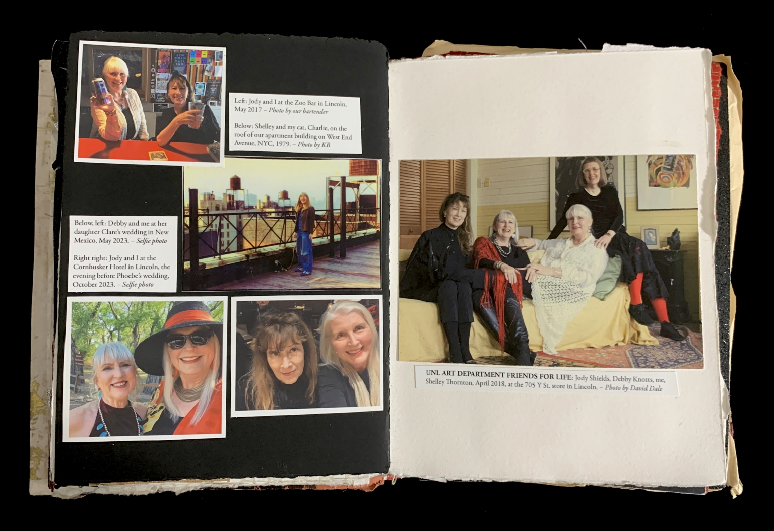 - Left: Jody and I at the Zoo Bar in Lincoln, May 2017 - Photo by our bartender Below: Shelley and my cat, Charlie, on the roof of our apartment building on West End Avenue, NYC, 1979. - Photo by KB Below, left: Debby and me at her daughter Clares wedding in New Mexico, May 2023. - Selfie photo Right right: Jody and I at the Cornhusker Hotel in Lincoln, the evening before Phoebes wedding, October 2023. - Selfie photo UNL ART DEPARTMENT FRIENDS FOR LIFE: Jody Shields, Debby Knotts, me, Shelley Thornton, April 2018, at the 705 Y St. store in Lincoln. - Photo by David Dale